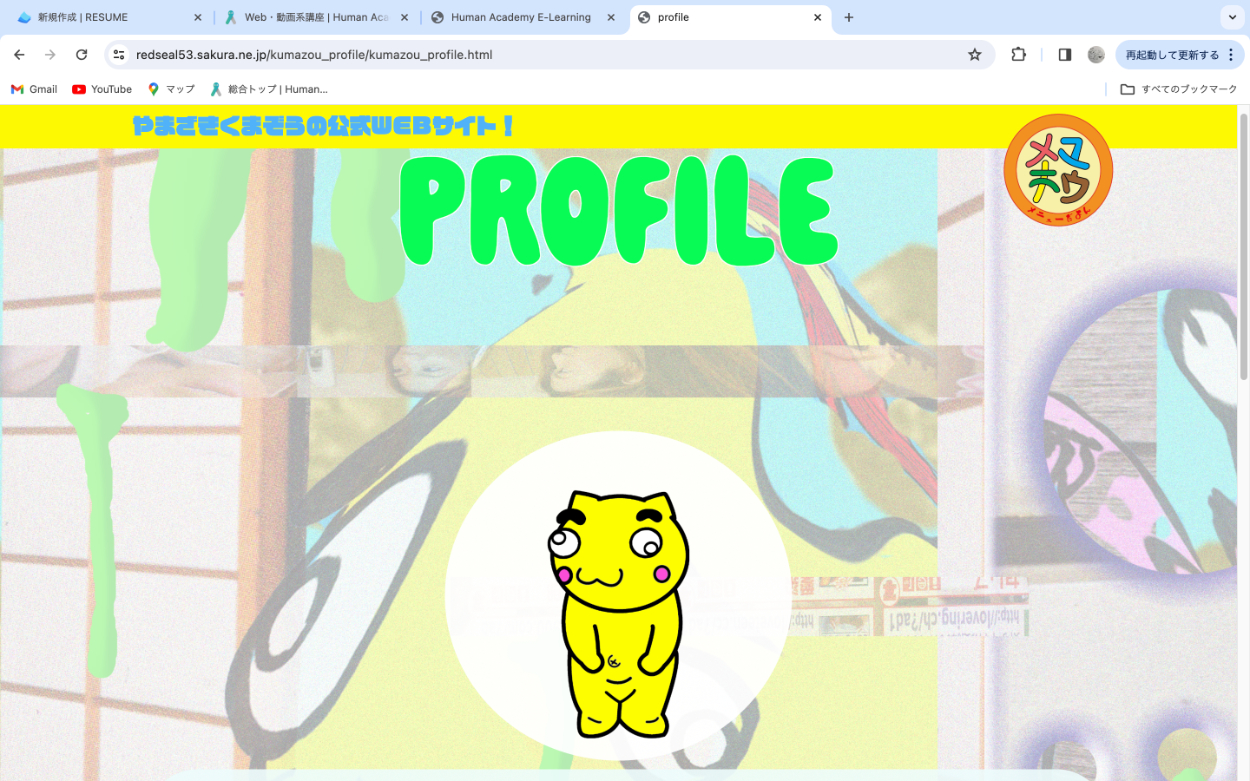 さらにトップ画面ではIllustratorやAfter Effectsを使用して制作したアニメーション動画が添付されており、再生すると音楽と共にキャラクターが動き、自身のWEBサイトのタイトルロゴが現れる仕組みとなっています。