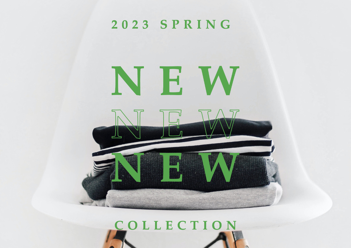 春の新作画像を背景にし、「NEW」の文字を3つ並べました。真ん中だけふち文字にし、リズミカルな印象を与えています。