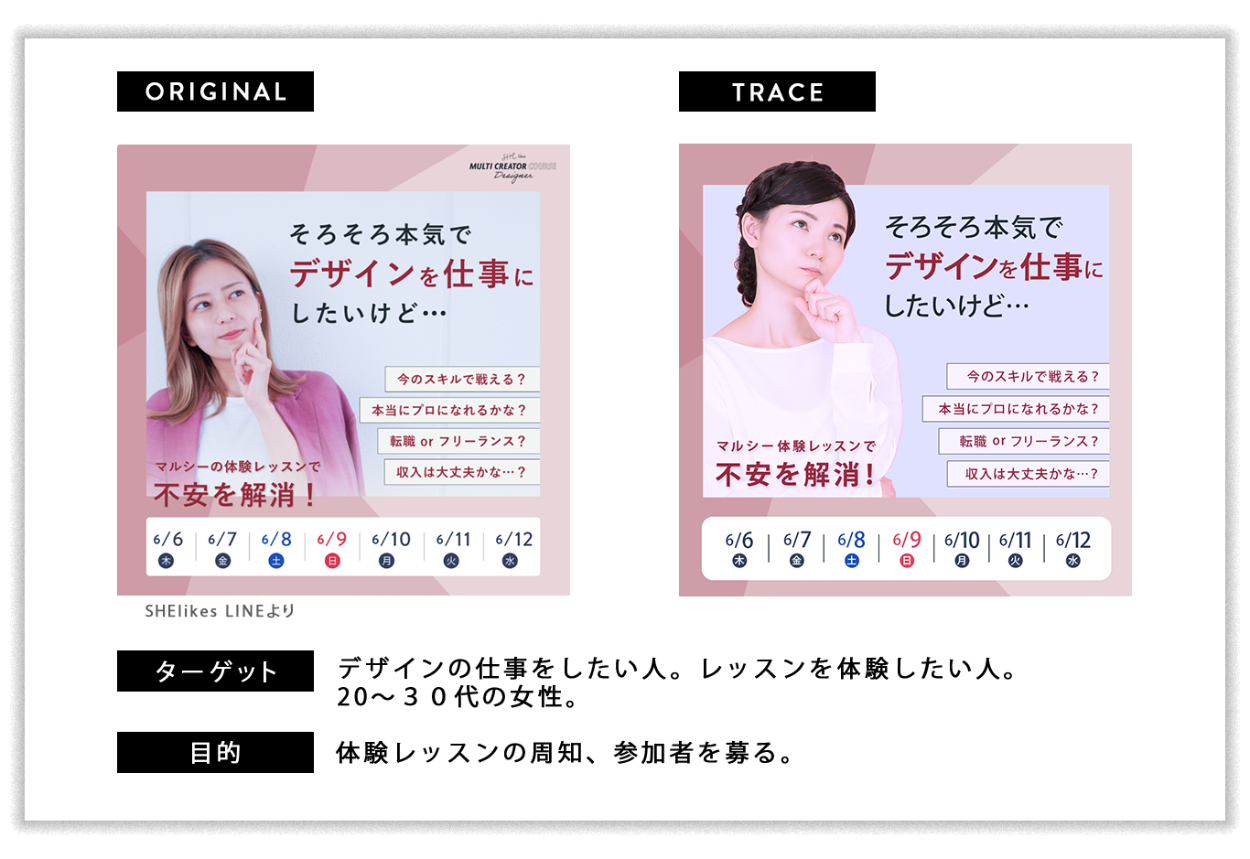 - 同じような女性の写真を探したが、私は向かって右に傾いた女性の写真にしたことと、枠からはみ出す配置に変更したため、文字全体が窮屈になってしまった。