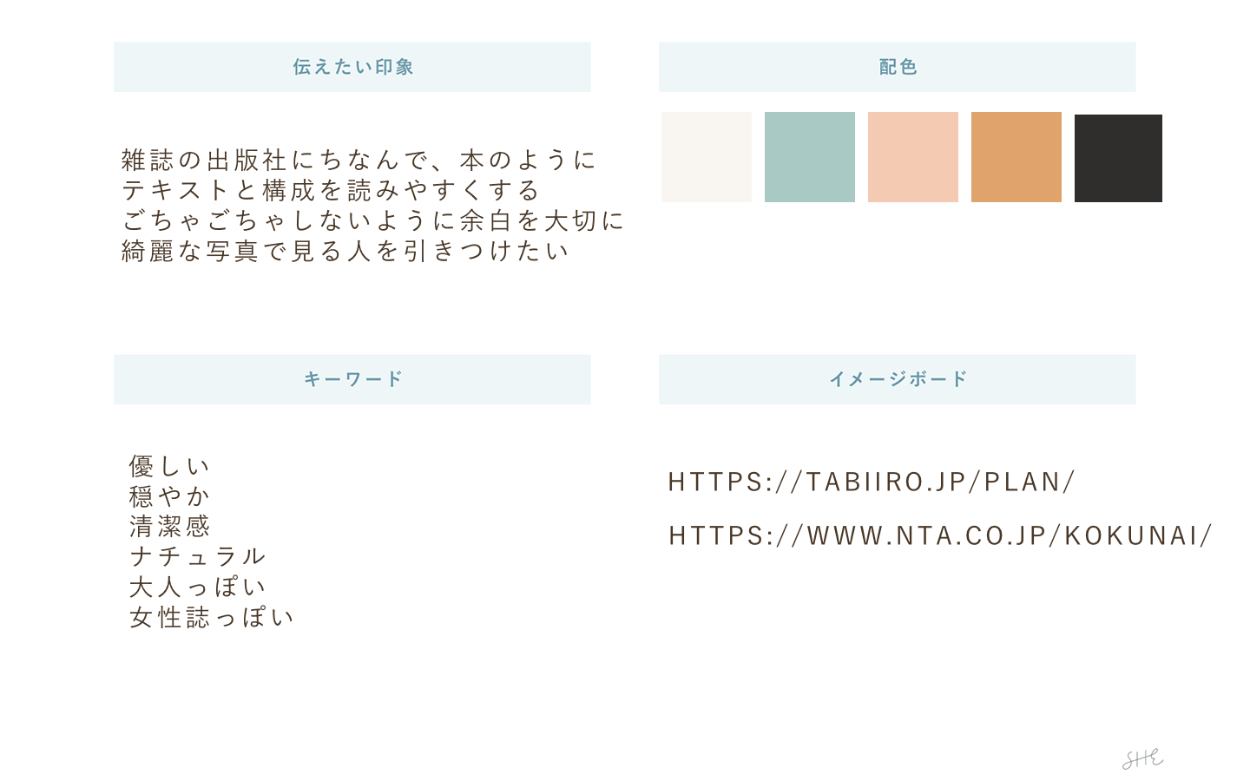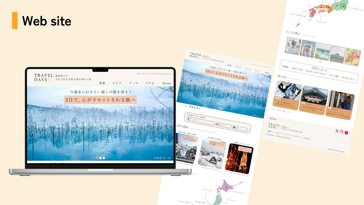 出版社が手がけるHPなので、写真が綺麗で見やすく、文章を読みやすいようにレイアウトしました。 また、上記に挙げているターゲットに沿って派手すぎず、清潔感がありナチュラルな印象を与えられるように 配色とフォントを大人っぽいものにしました。