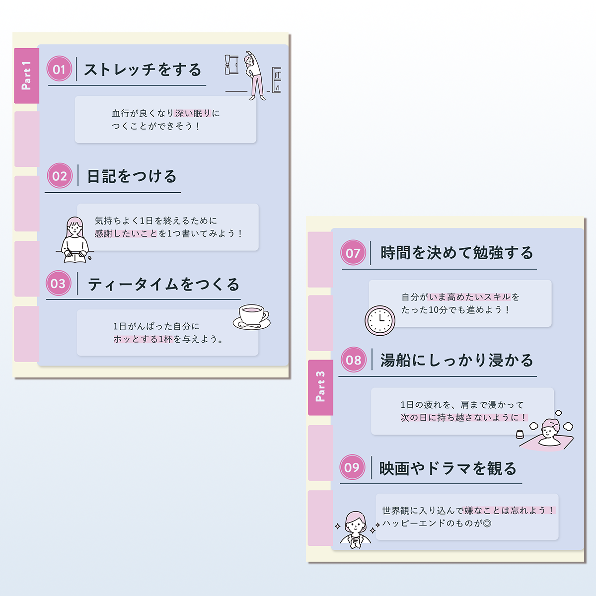 目的:自己肯定感を下げる原因となるストレスや疲れを和らげ、ユーザーの気分をポジティブに転換する習慣を提案