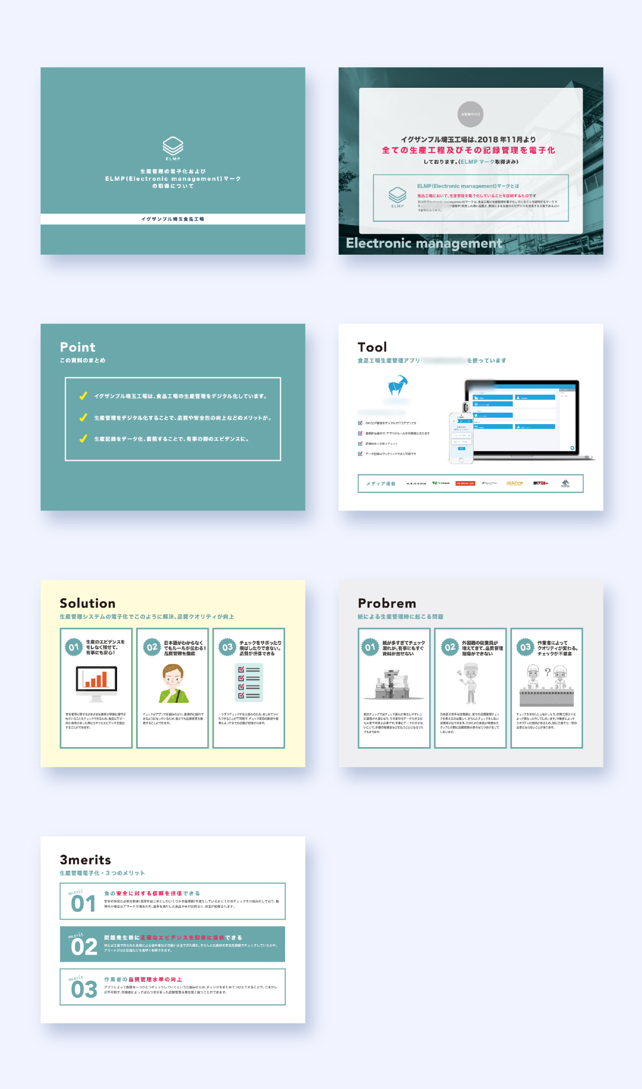 工場SaaSアプリ「PaperLess」営業資料 太田裕美子 Designer OVERVIEW ELMPマークの資料を作成しました。 YEAR 2019 概要工場を電子化しているというマークを取得していますという営業資料のためのテンプレートです。Illustratorで作りパワーポイント化しました。