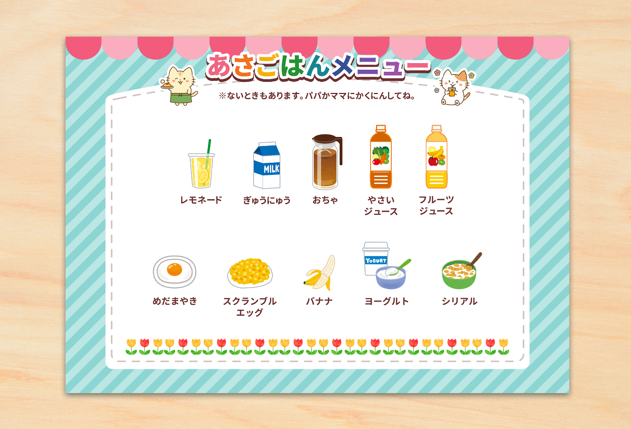 子供達朝の支度をスムーズに行う為に、オリジナルのメニュー表を制作しました■制作時間:約4時間 ■担当フェーズ:コンセプト設計/ビジュアルデザイン