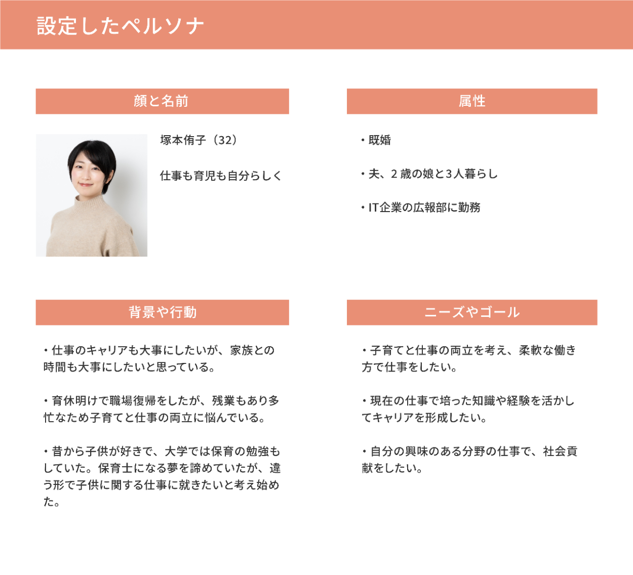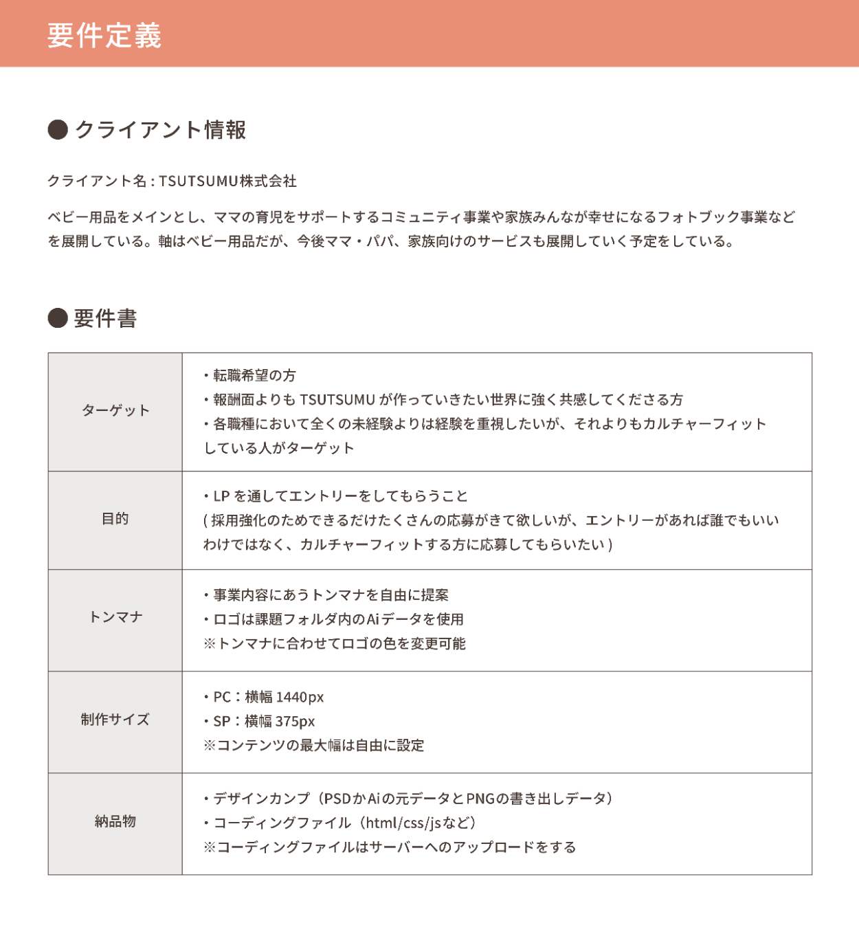 クライアントから提示された要件書と、それを元に自身で設定したペルソナを以下の資料にまとめました。
