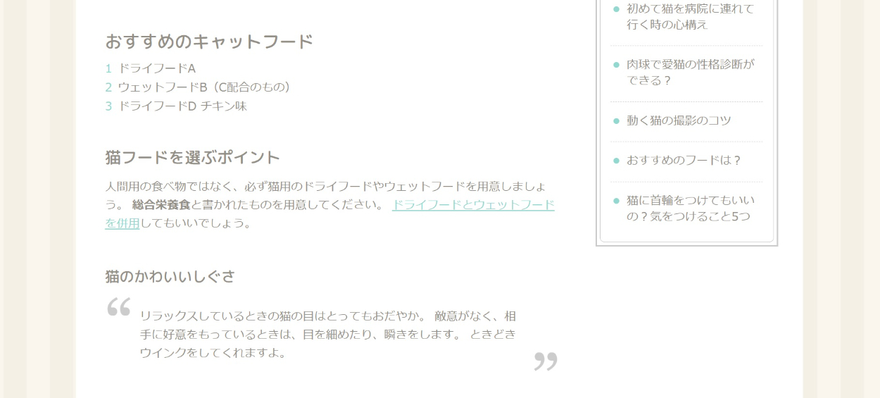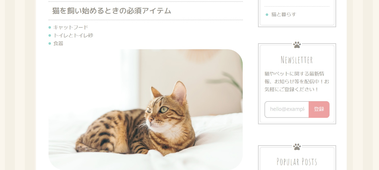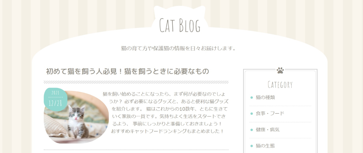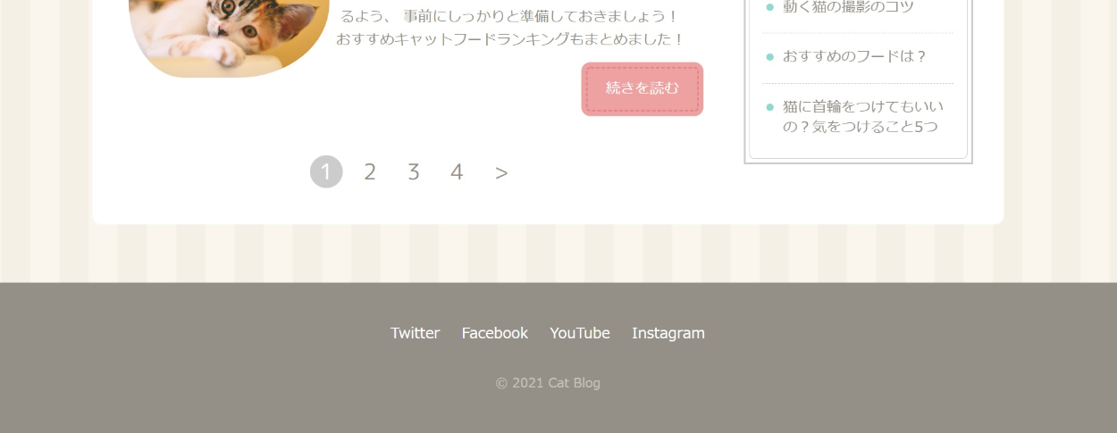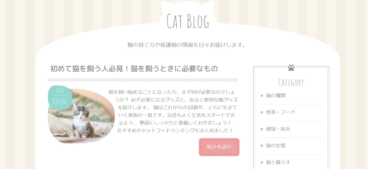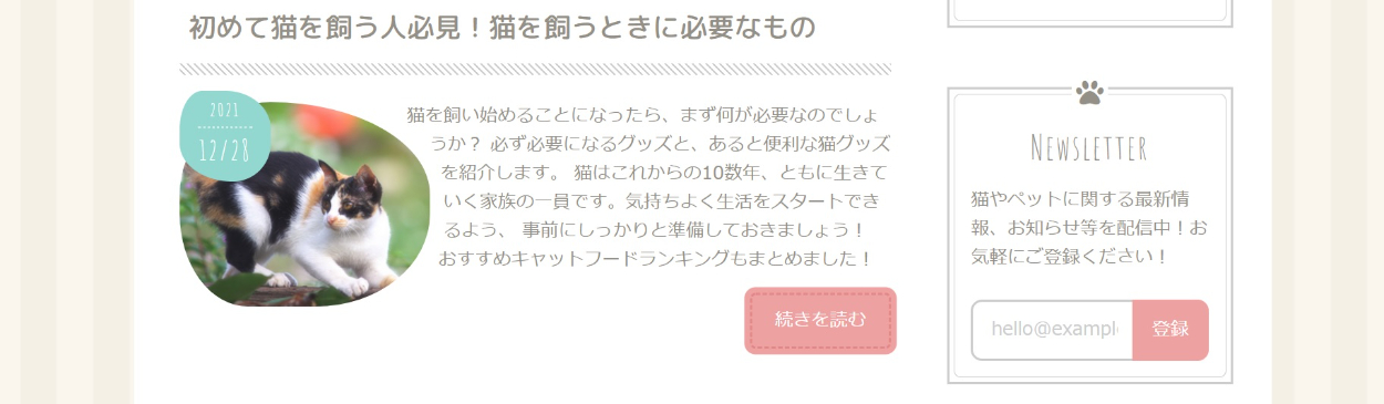 猫に関するブログサイトの作成(HTML&CSS) やま コーダー、マークアップエンジニア OVERVIEW 著作『HTML&CSSとWebデザイン実践講座』に掲載している、 猫ブログサイトの模写コーディングを行いました。 YEAR 2021 【ひとことメモ】・楕円形のサムネを制作することにより、見た目にオシャレ感が加わった。