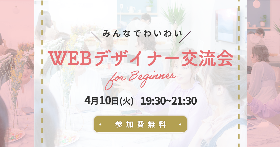 ターゲットがWebデザイナーとして働き始めてまだ日が浅く、不安を抱えている方を想定しているため、あまり気取らず親しみやすい’わいわい’感を意識しました。交流会をイメージした画像はメインで伝えたい内容のため背景としつつ、印象が強すぎないよう透明度を調整することで柔らかい印象にしました。