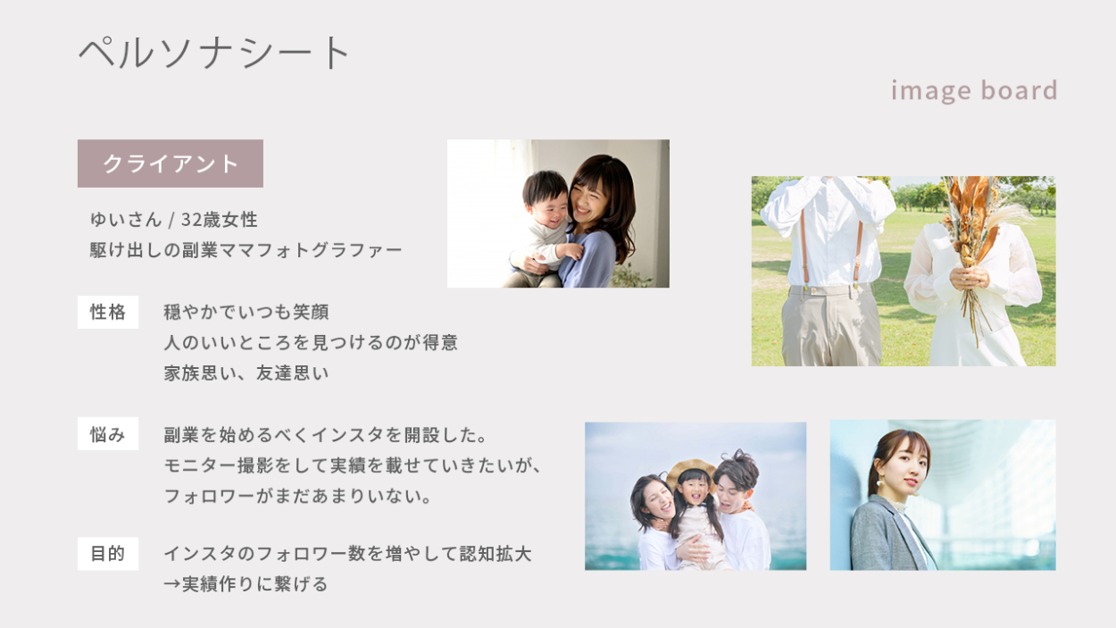 フォトグラファーの活動のためにインスタを開設した人をペルソナに設定しました。落ち着いたトーンのベージュ、ピンクブラウンを使用、フォントは明朝体、スクリプト体を使用し、洗練されて大人っぽい、柔らかいデザインに仕上げました。