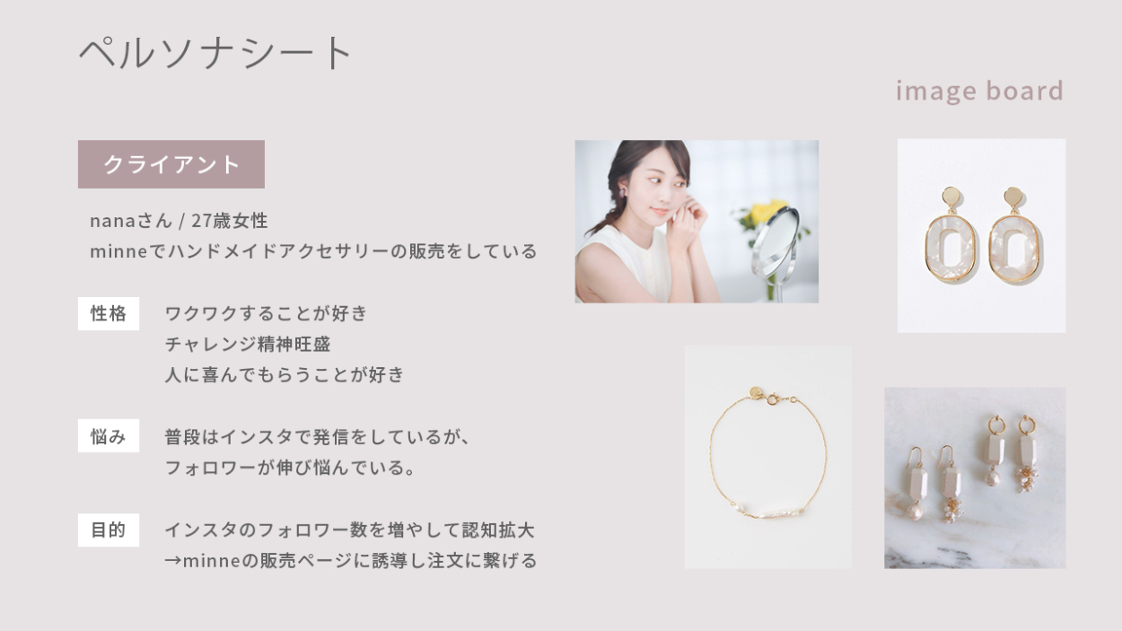 ハンドメイドアクセサリーの販売をしている人をペルソナとして設定しました。くすみピンク、ブラウンを使用して同系色でまとめ、女性らしくかわいいデザインに仕上げました。