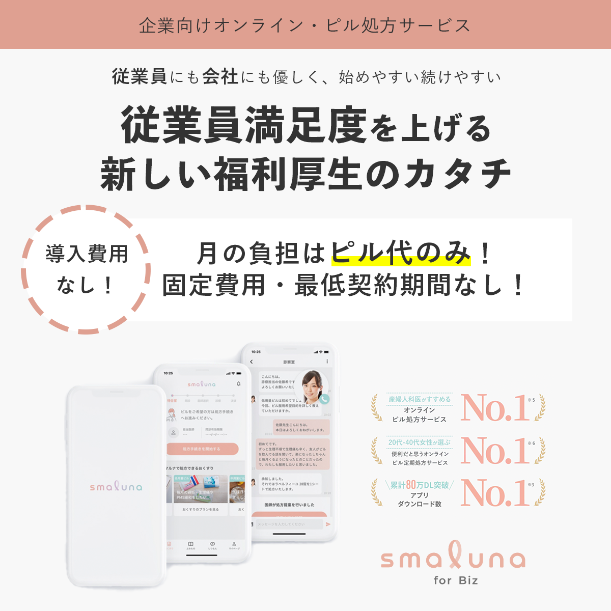 内容:スマルナfor Bizとは:PMSや月経で悩む女性社員に対し、ピル代金を会社負担でご利用いただけるオンライン・ピル処方サービス