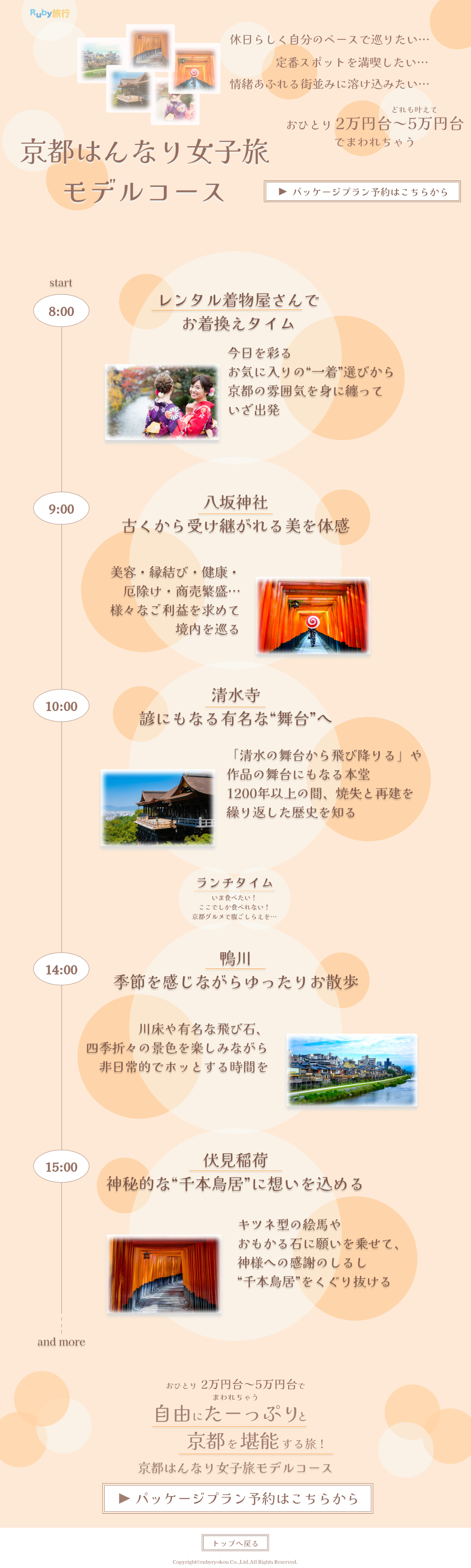 首都圏発の新幹線(往復)+お宿のパッケージプランを販売します。 LPでは女性の方に楽しんでいただける京都旅行モデルコースを紹介し、パッケージプランの検索ページに誘導する流れで作成をお願いいたします。 本LPへの誘導は、Ruby旅行公式HP内に設置の特集バナーからとなります。 パッケージ価格:お一人様 2万円台〜5万円台