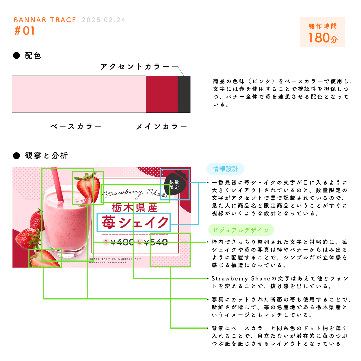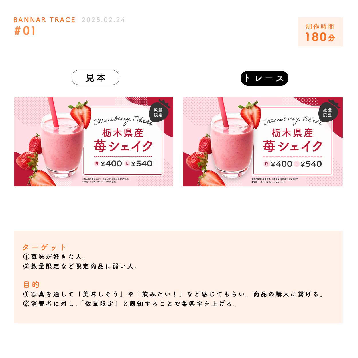 - ただトレースを作業的にこなすのではなく、このバナーで伝えたい目的とターゲットは何か、そのためにどういった配色やレイアウトとなっているのかという点を考えながら取り組みました。