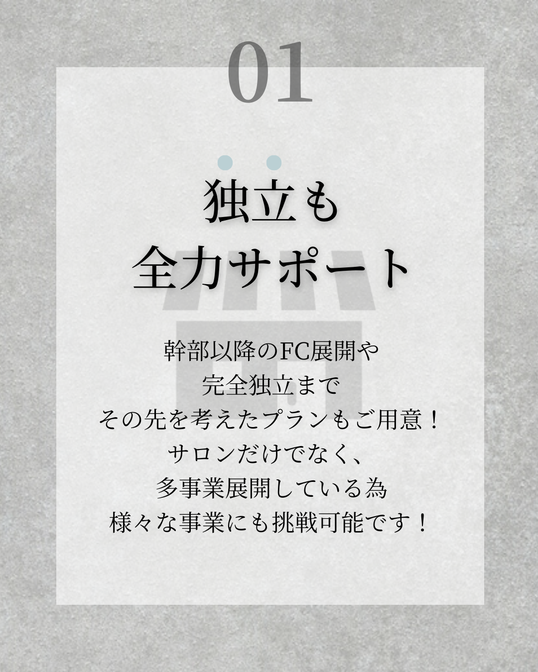 ・指定カラーがモルタルやグレー、かつシンプルにということだったので、背景をモルタルにしモルタルと相性の良い白を合わせ、強調したい部分に薄いブルーを使用しました。