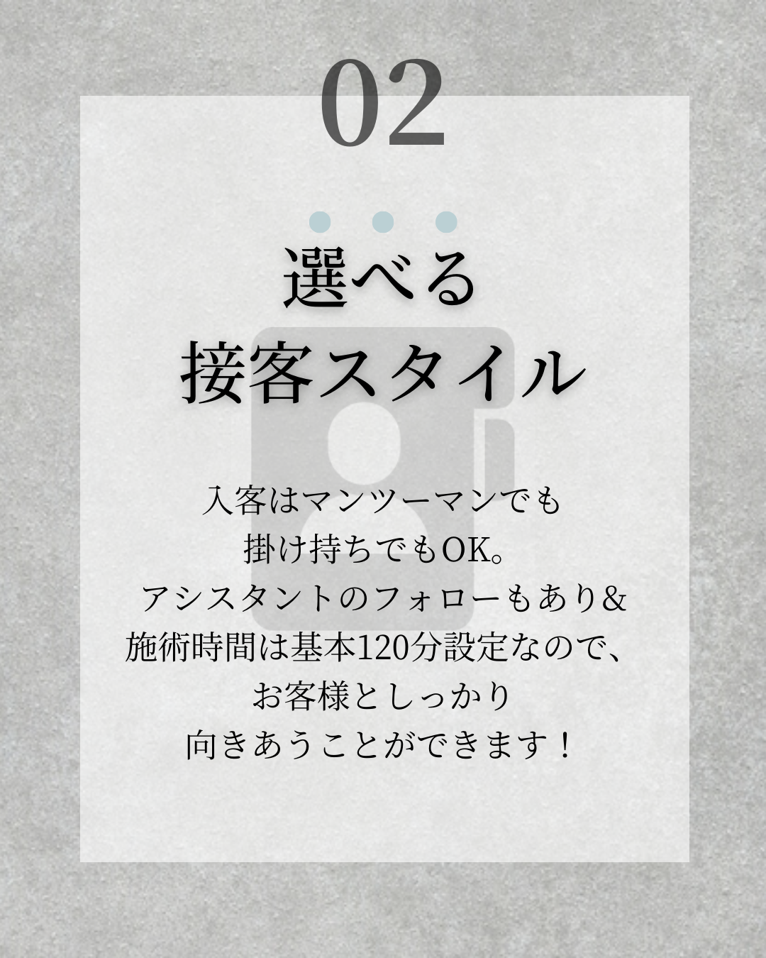 ・文章が多くなるので各ページの要点がわかりやすいよう、配置は上から下でシンプルに、中央揃えにしました。かつ、いくつポイントがあるのか視覚的にわかりやすいよう、上部に数字も配置しています。また各ページのポイントに合わせたアイコンを背景に使用し、文章を読むだけの時よりもイメージしやすいよう工夫しています。
