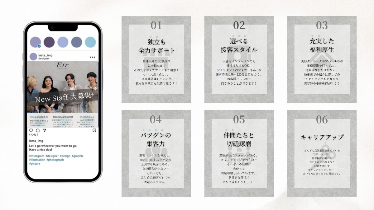 関西・関東にて29店舗展開(24年4月現在)している美容室Eir様の公式Instagramにおける求人広告を制作しました。投稿のデザイン(アイコンや素材探しから構成)を担当いたしました。