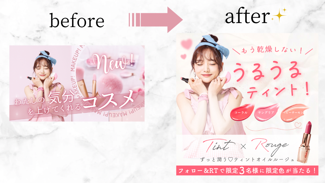 Beforeでは、広告にもかかわらず「かわいい」を優先してターゲットや商品のよさが伝わらないため、Afterでは「誰に」「何を」「どのように」売りたいのかを明確にして、デザイン設計を行いました。