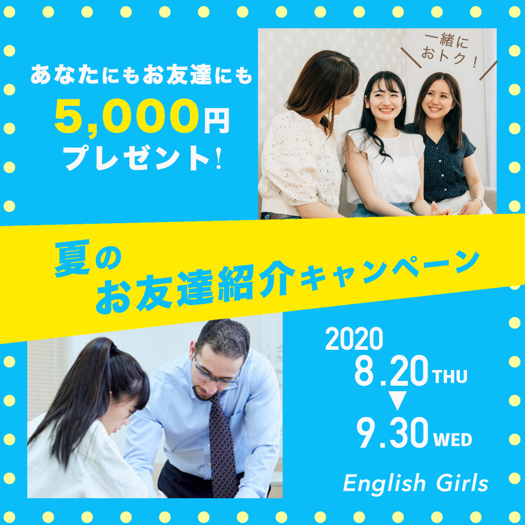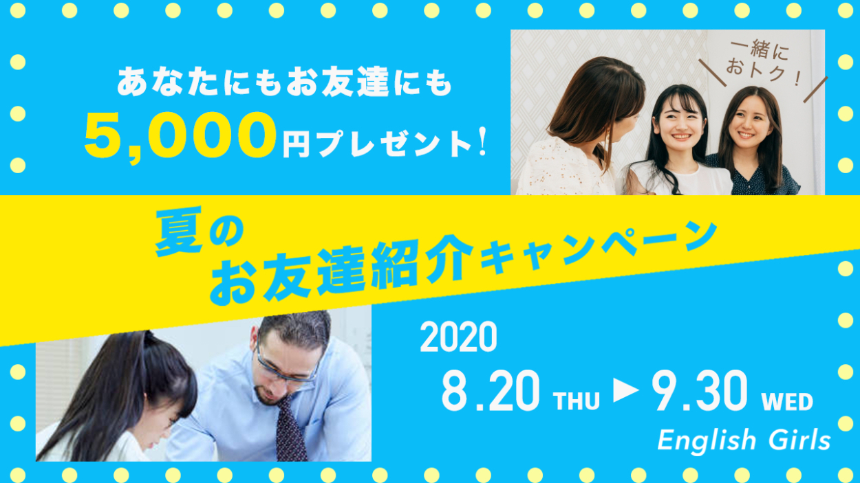 <文言>①一緒にお得!②夏のお友達紹介キャンペーン③あなたにもお友達にも5,000円プレゼント④期間:2020年8月20日〜9月30日