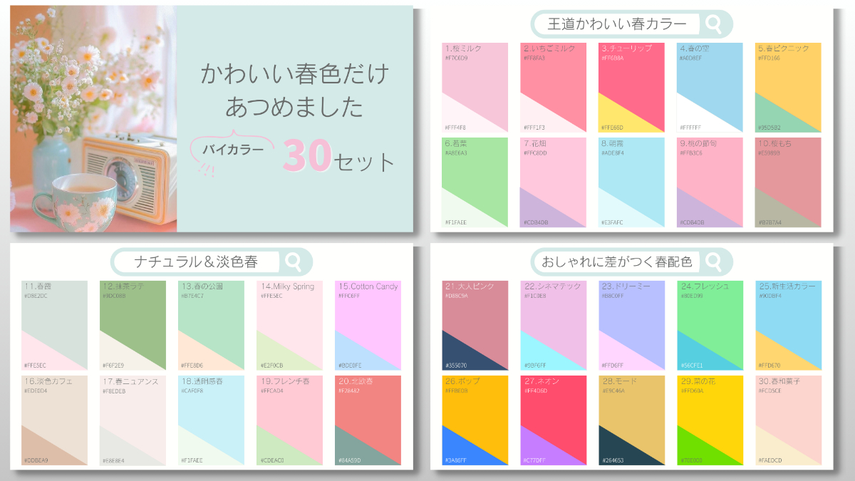 プレミアムX図解(30選) 智愛(ともえ) スライド/図解デザイナー OVERVIEW 春らしい配色を探す人に向けて、すぐに使えるバイカラー配色をまとめたいと思い制作しました。 【情報元コンテンツ】ChatGPT、Pinterest【制作のポイント】”そのまま使える”実用性重視テイスト別に分類春らしさを意識した色設計余白と視認性を意識