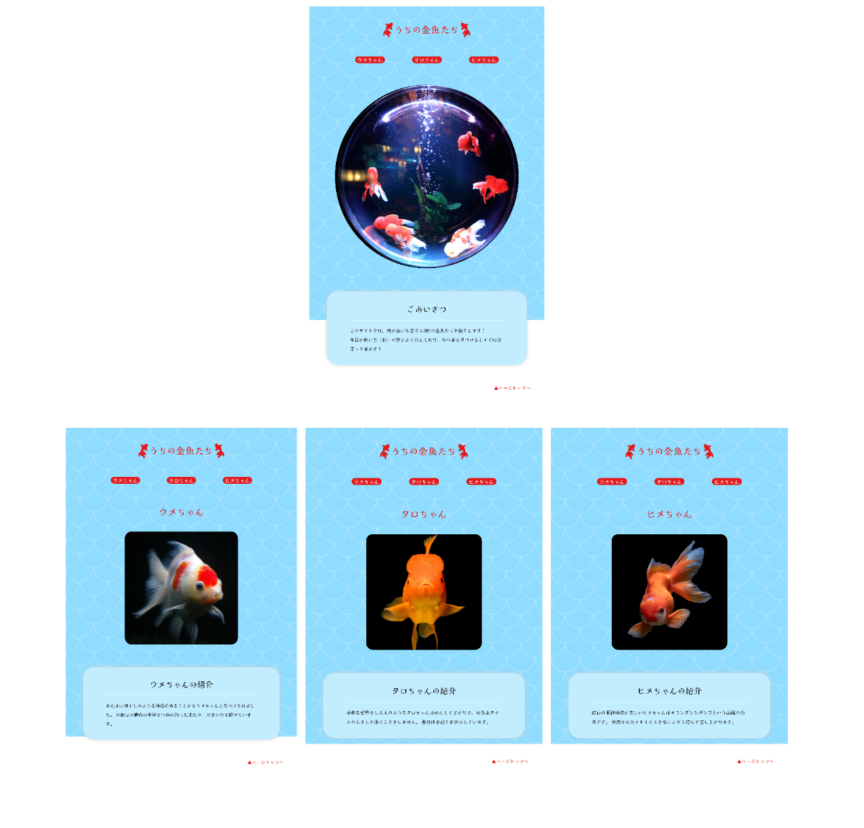 金魚らしさをイメージするデザインで、自作のサイトであることを感じさせる少しチープなつくり。