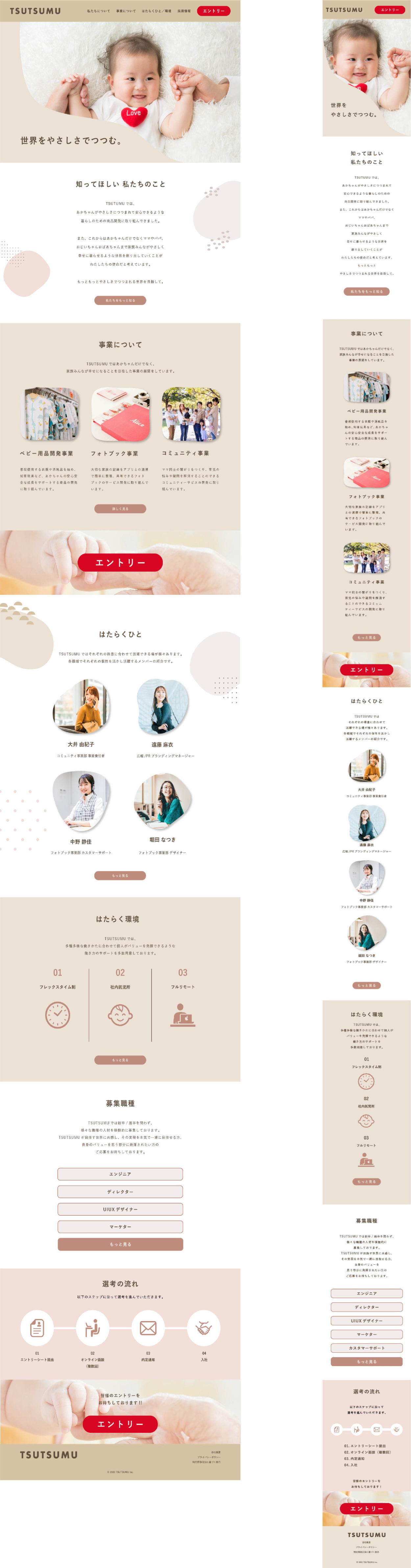 一見、企業名や事業から温かい、優しそうな企業をイメージしますが、「企業の世界観に共感した人材を!」という想いから、しっかりとした軸が感じられました。その軸をふんわりした雰囲気で包んでいる、そんなTSUTSUMUに合ったデザインを心がけています。