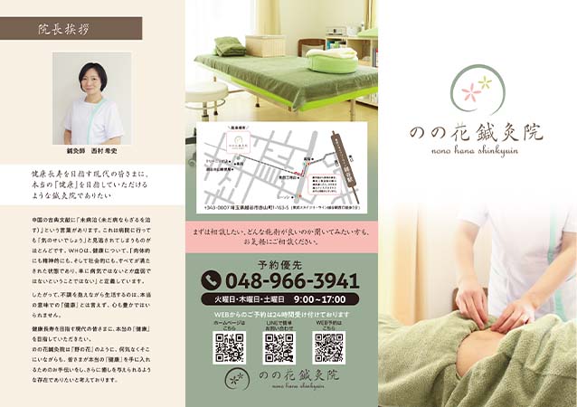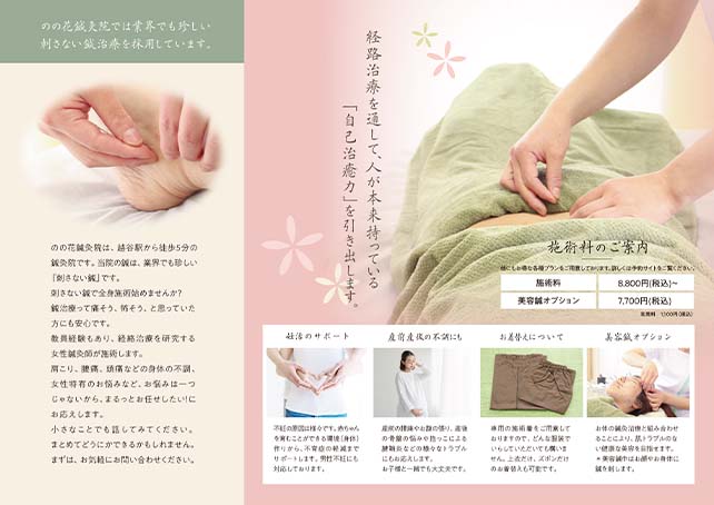 【実案件】のの花鍼灸院様 鍼灸院紹介用3つ折りリーフレット作成、写真撮影