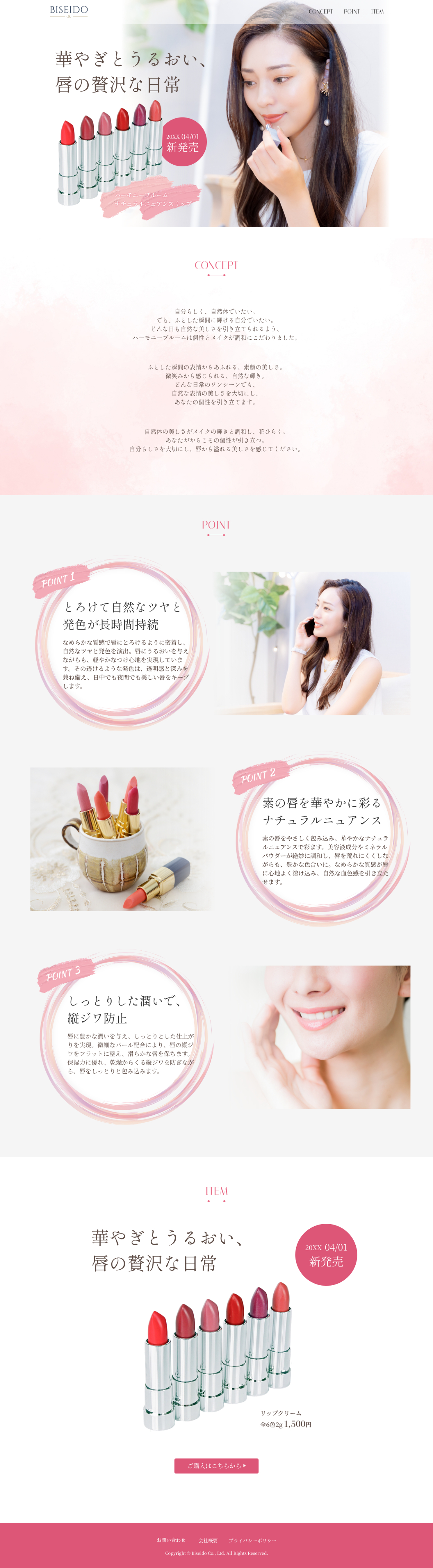 リップクリームのWEBページ デザインカンプ たむのぶ webデザイナー OVERVIEW HerTechの課題で作成しました。 ■要件定義4/1新発売のリップクリームのWEBサイトを特設したいInstagramのバナー広告から遷移できるサイトになる20代女性に興味を持って買いたいと思ってもらえるようなデザインにしたい実際に購入できるように購入ボタンも設置する■デザインカンプ
