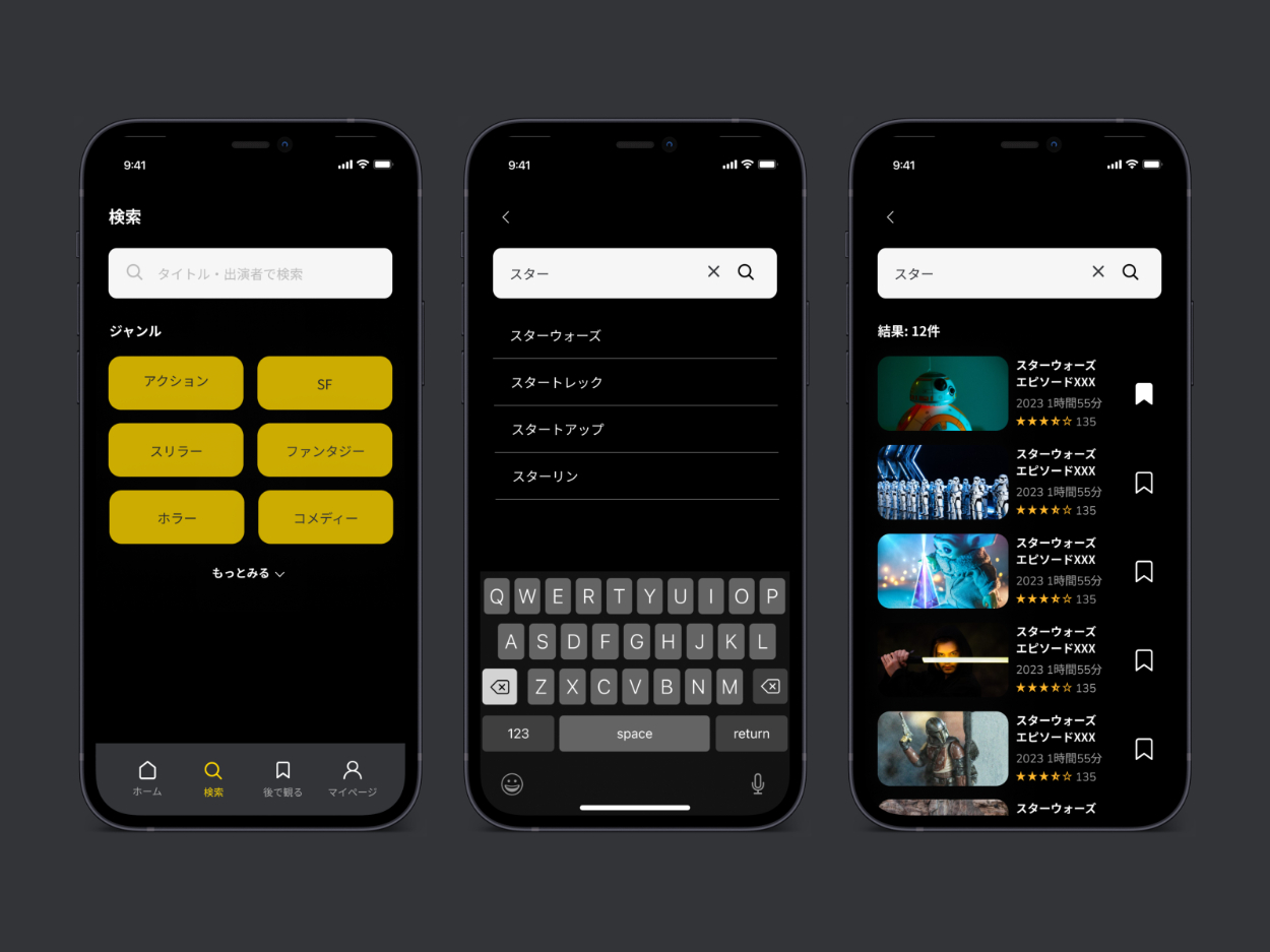 ・映画の検索結果、後で観るリストは一覧性重視し、一度に多くの作品を見られるデザインにしました。
