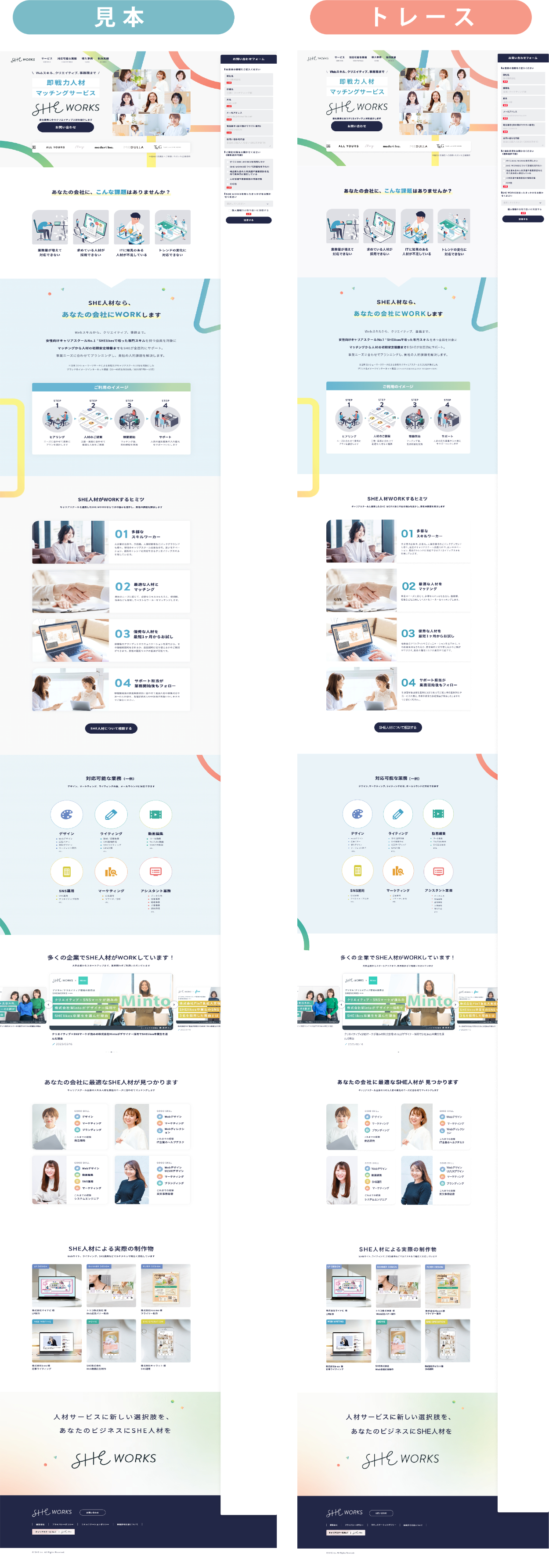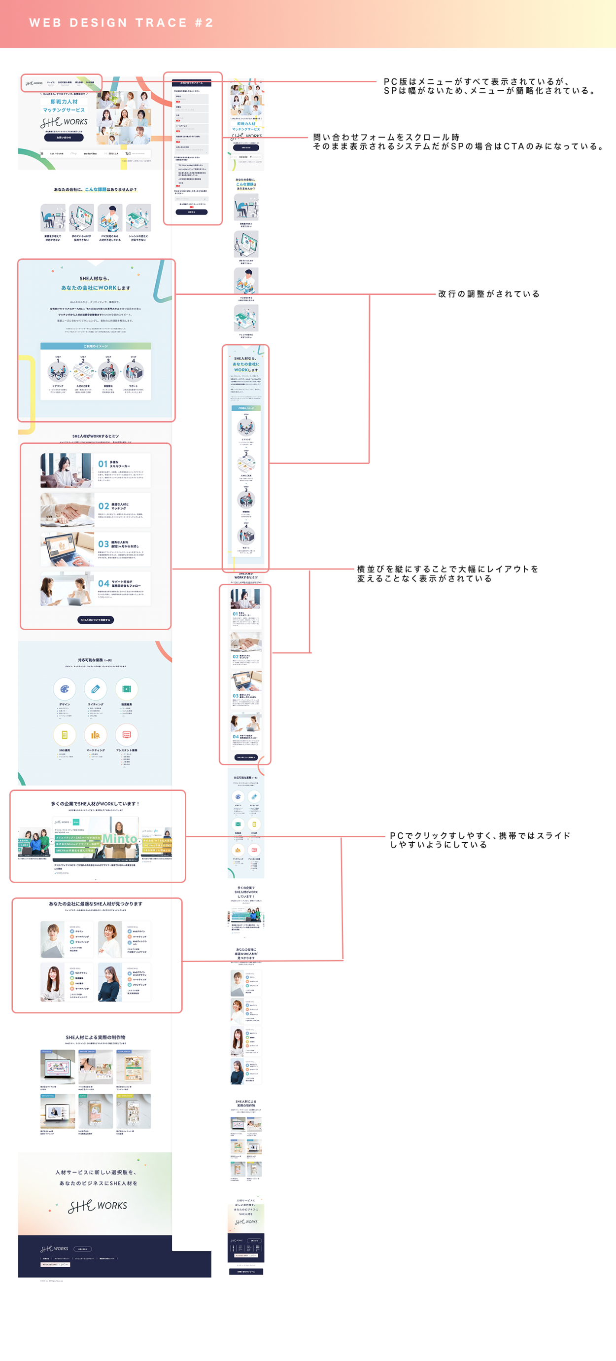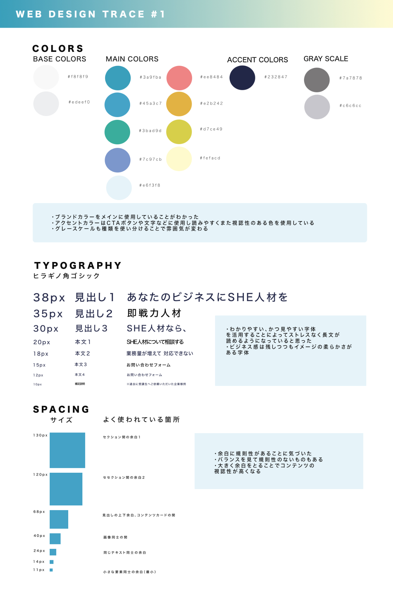 SHE PROデザイナーコース(旧SHElikes MULTI CREATOR COURSE)の課題にてWebページトレースを行いました。合わせてスタイルガイドの作成、PCとスマホ画面の分析も行いました。