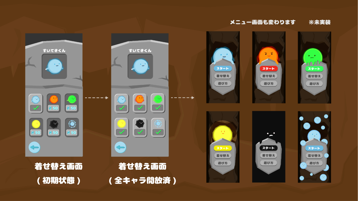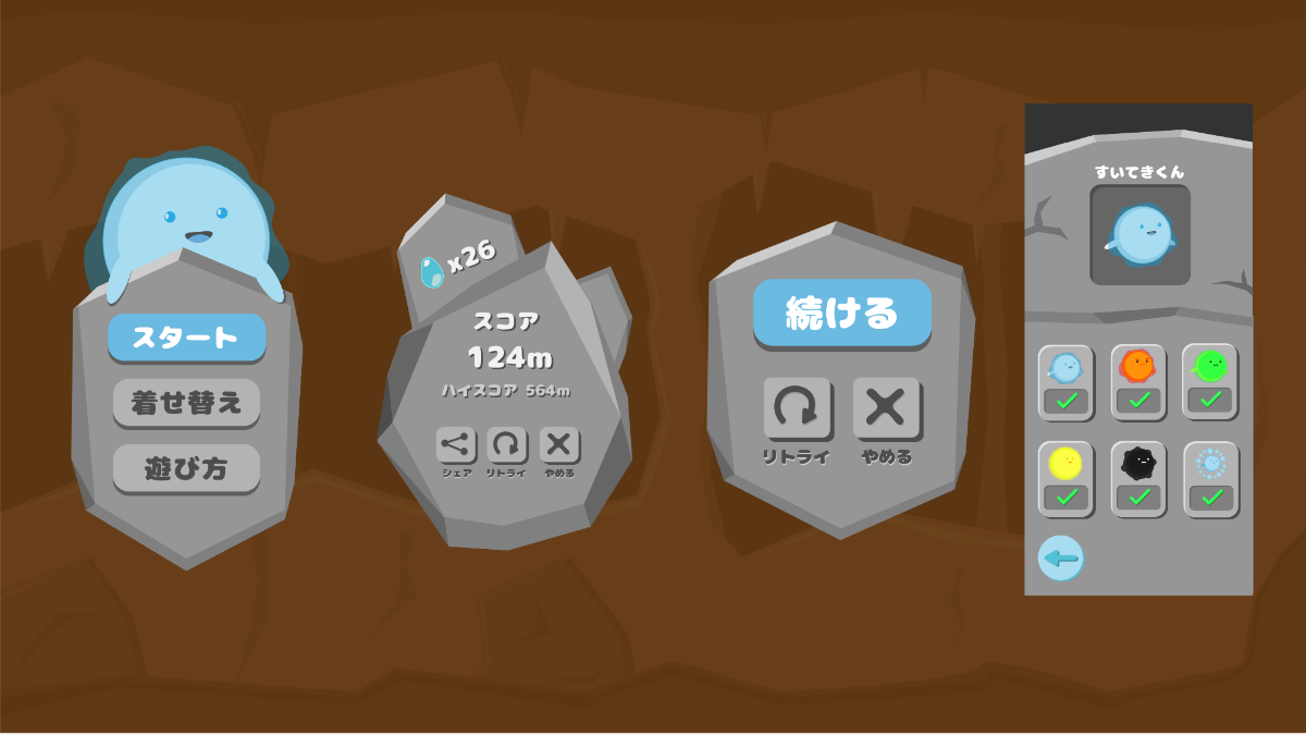 ユーザーに長くプレイしてもらうために、やりこみ要素として着せ替え機能を追加しました。ハイスコアを取ることと、着せ替えをコンプリートすることを目標としてプレイしてもらおうと考えました。