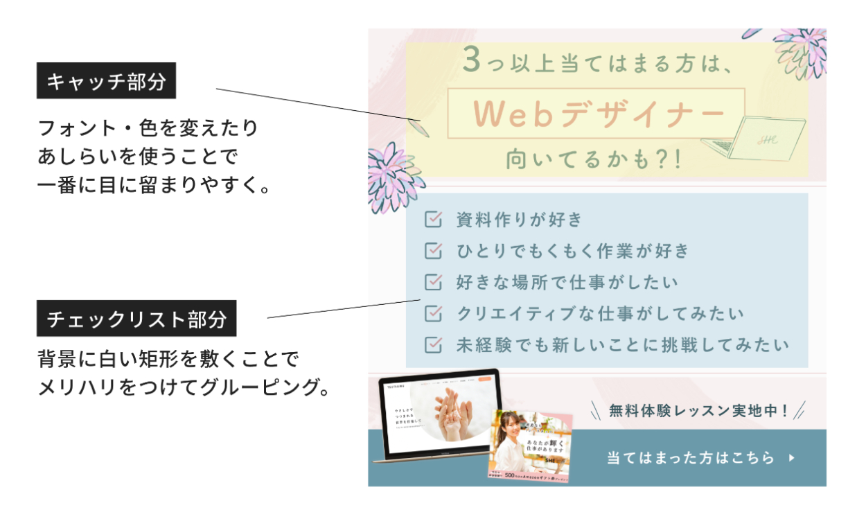 ①コピー部分とチェックリスト部分のメリハリの付け方