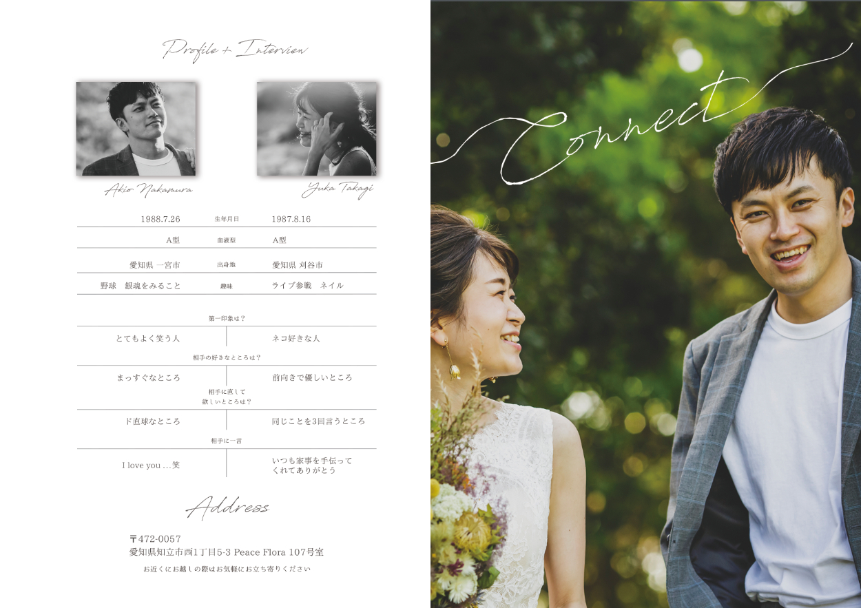 大切なゲスト皆様、そして直接は関わりを持っていない未来の新郎様新婦様までも、、、お二人の結婚式をきっかけに全ての点が繋がり、未来へと続いていく、、、そんな想いを込めて「connect(繋ぐ)」というキーワードを取り入れ、全てが繋がっていくことを連想させるように、文字を端から端まで繋げたデザインを取り入れました。