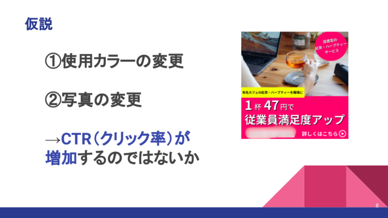 ・CTR(クリック率)の数値から現状分析を行い、仮説を構築しました。課題・仮説をしっかりと明記しておくことでわかりやすい資料を心掛けました。