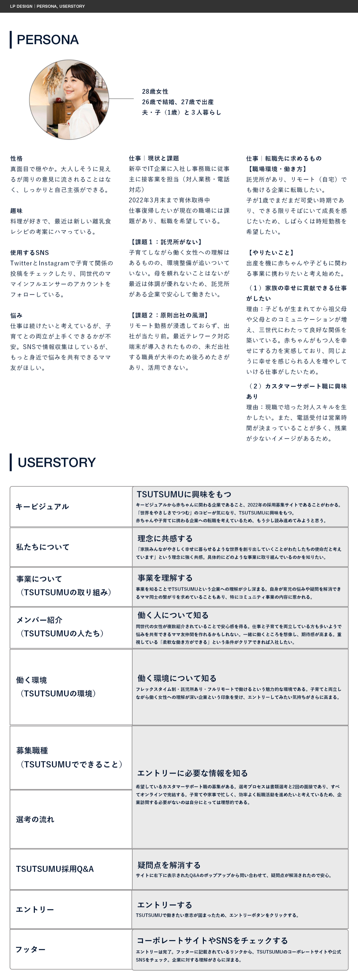 今回は自らペルソナを設定しましたが、詳細に決めておくことでその後の情報設計やビジュアルデザインをスムーズに進められました。ユーザーストーリーについても、コンテンツごとにどのような感情をユーザーに喚起させたいかを具体的に考えておくことで、訴求力の高いサイトになることを学びました。