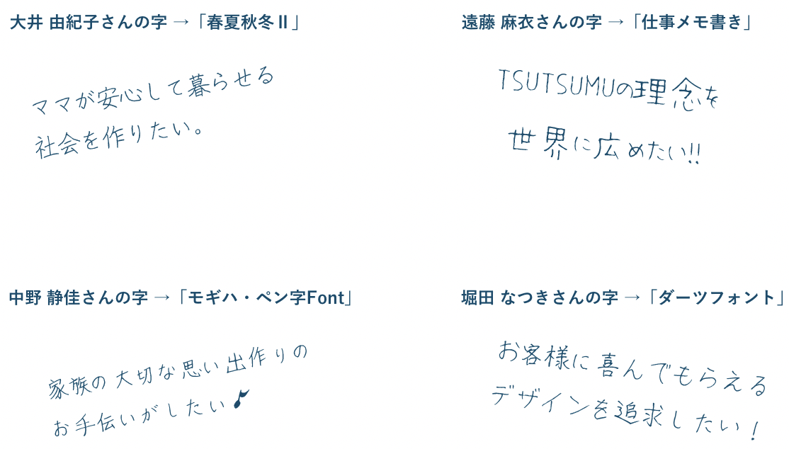 メンバー紹介部分は親しみやすさを重視し、職場の明るい雰囲気や人間関係の良好さが伝わるようにしました。仕事のビジョンを各メンバーが手書きしたと想定し、異なる手書きフォントを探しました。