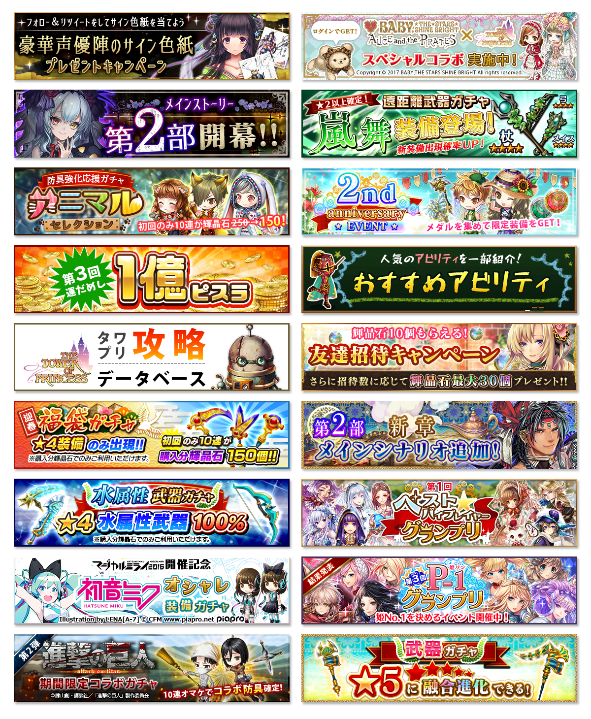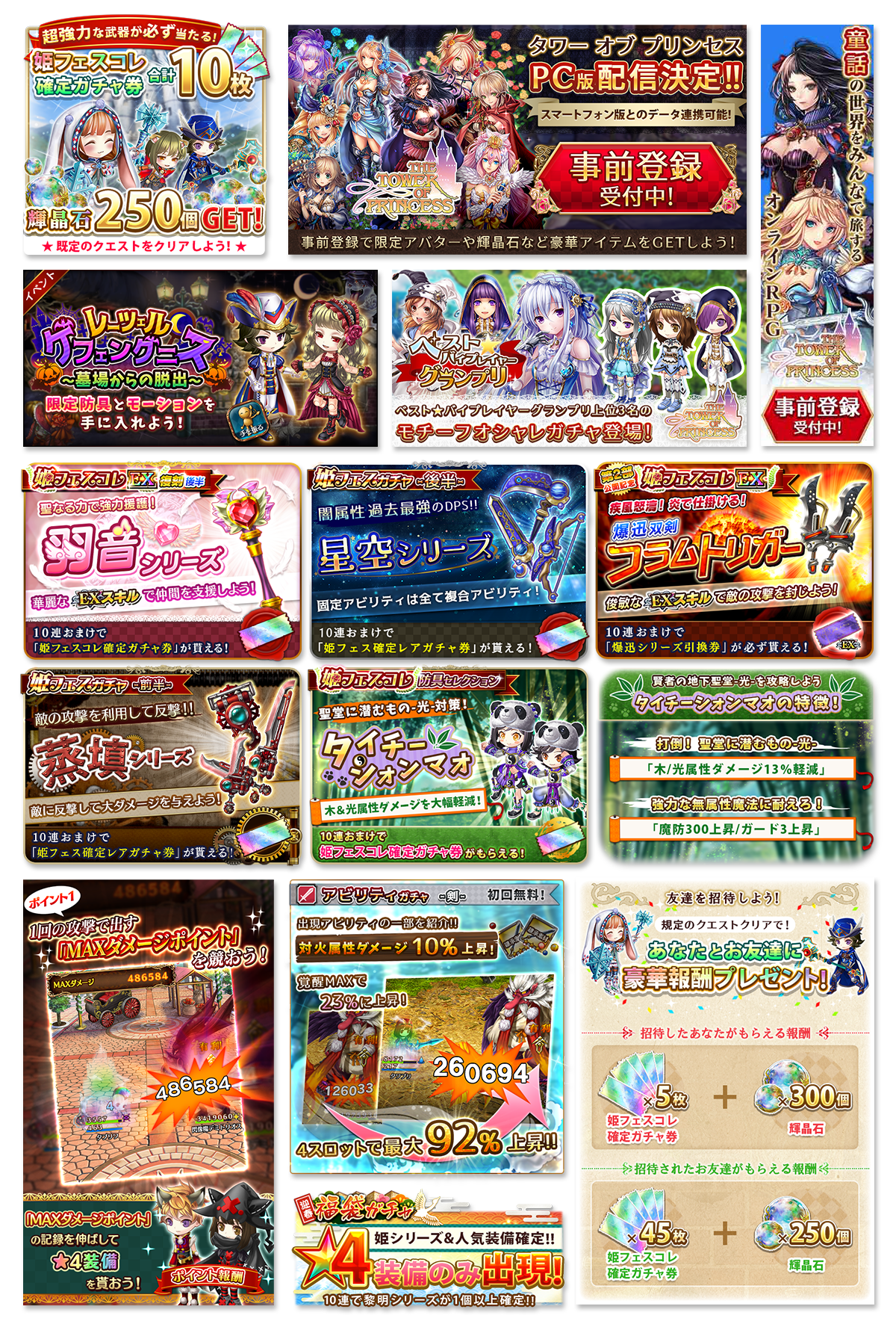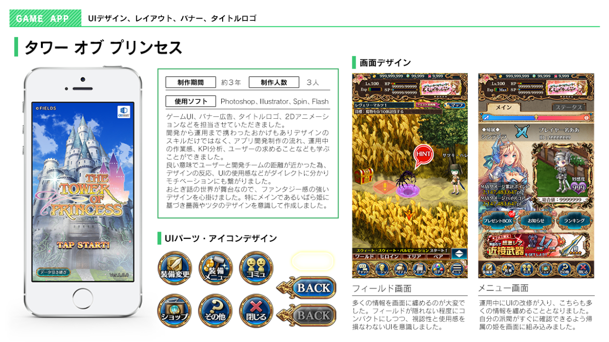 スマホ向けゲームアプリ「タワーオブプリンセス」の開発‣運営 主にゲームUI、バナー広告、タイトルロゴ等を作成しました。 期間 2015.4~2017.11