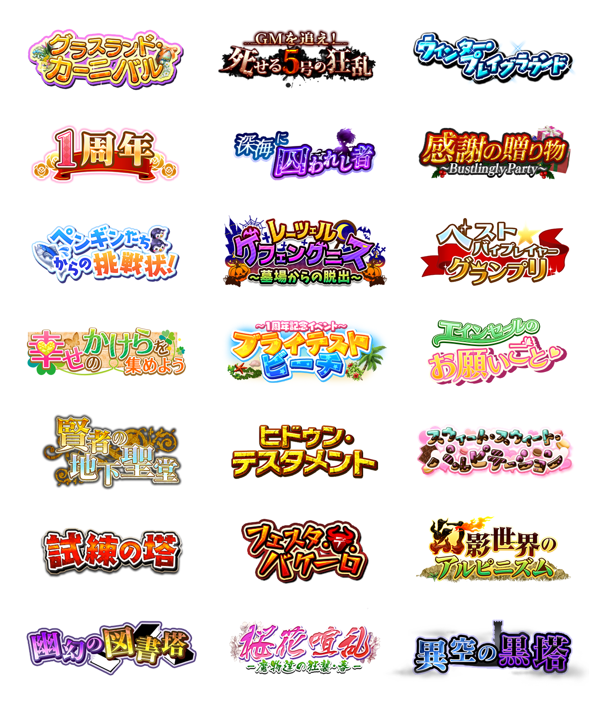 イベントの内容によってテイストが毎週変わるため製作が大変でしたが、そのお陰もあり可愛らしい~重々しいまで様々なテイストのタイトルロゴを作成することができました。ユーザーがタイトルを見て毎週ワクワクできるよう、飽きさせないことを常に意識してデザインしました。