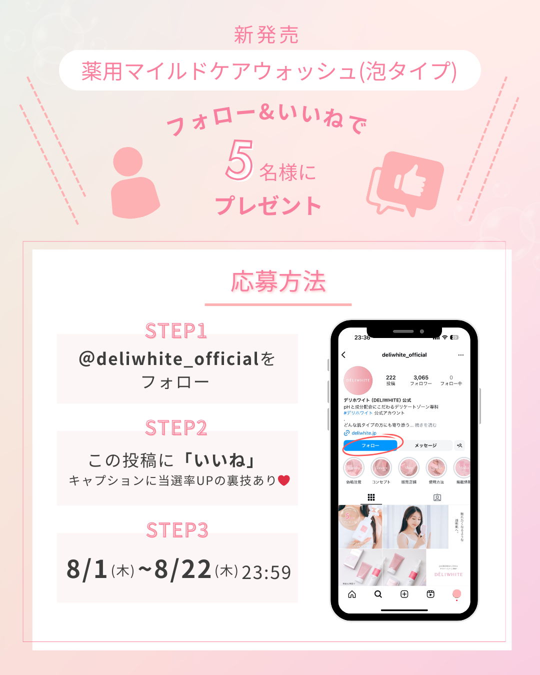 デリケートゾーンケア商品メーカーであるDELI WHITE様の公式Instagramで投稿するSNSキャンペーンバナーを制作しました。 ご依頼先から頂いたテキストを元に構成からデザインを行い、キャンペーンにワクワクしてもらえるよう華やかに明るいイメージで制作しました。