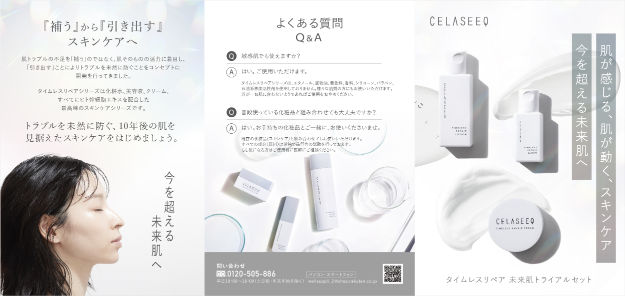 タイムレスリペア トライアルセット商品紹介同梱物 giine デザイナー OVERVIEW タイムレスリペアシリーズ(化粧水、美容液、クリーム)の3点が試せるトライアルセットの商品の詳細 YEAR 2022 表面裏面 制作サイズ W 312mm × H 148mm(三つ折り仕様)