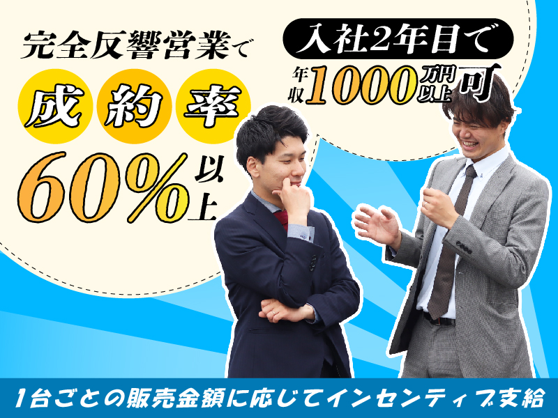 - 訴求:「完全反響営業で成約率60%以上」「入社2年目で年収1000万円以上可」「1台ごとの販売金額に応じてインセンティブ支給」