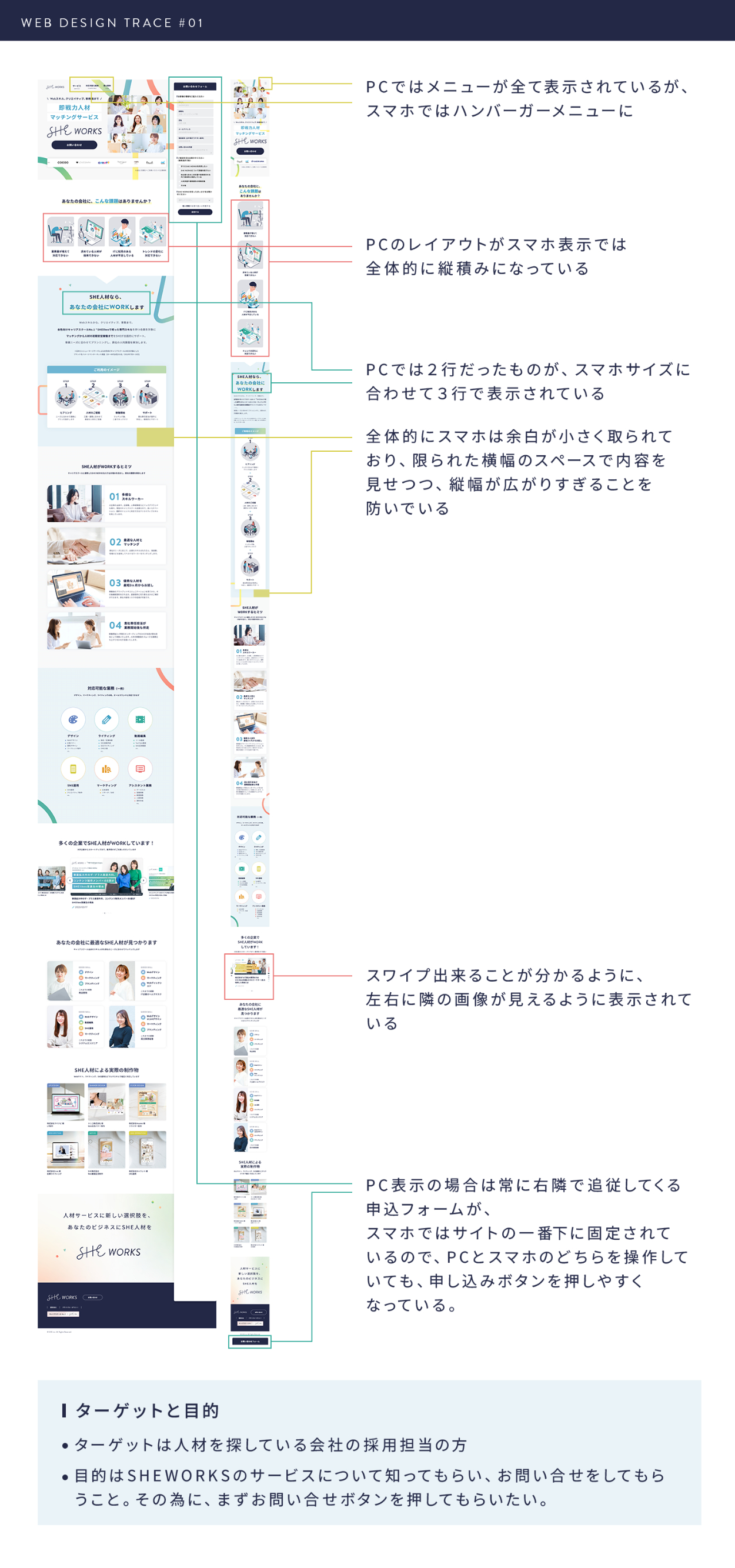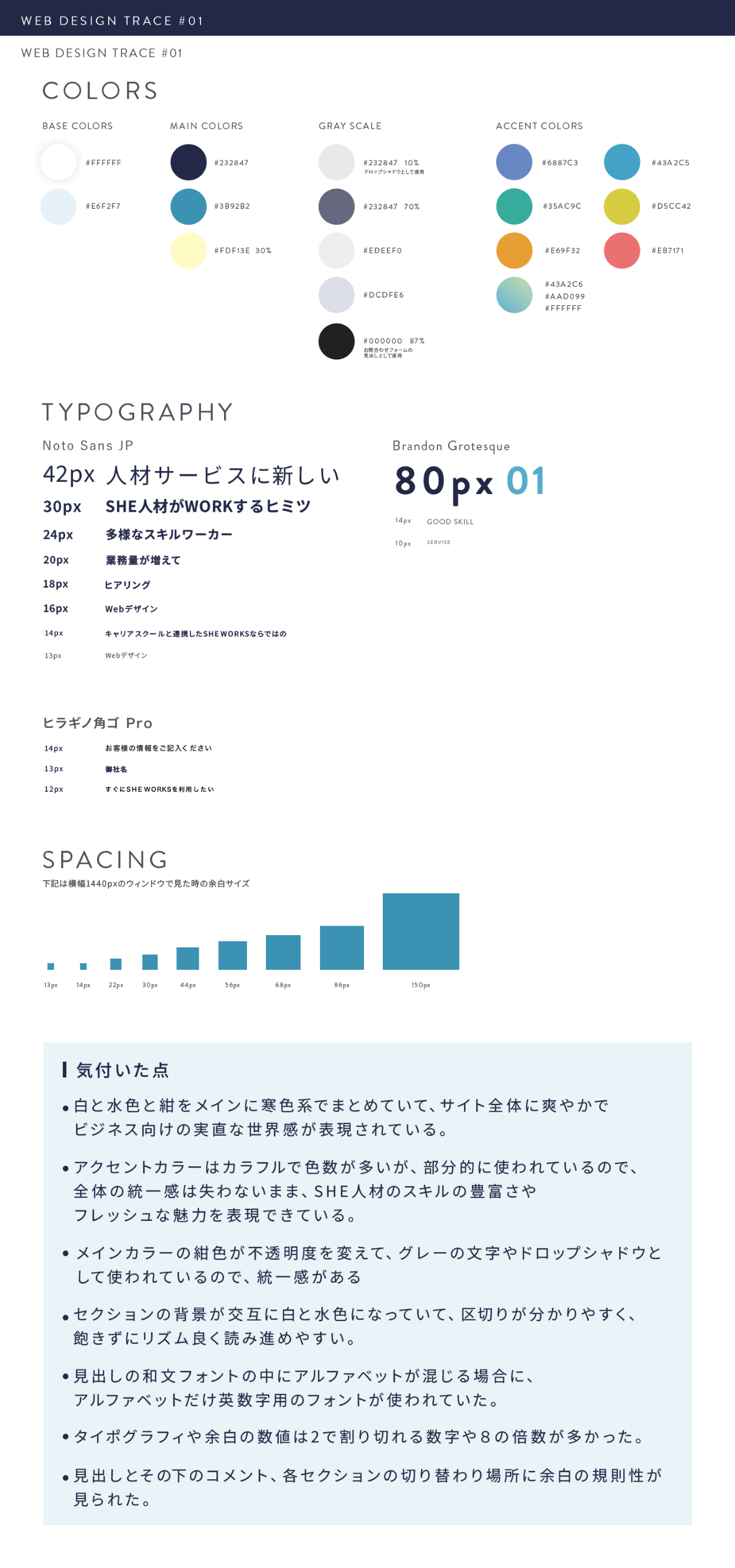 SHElikes MULTI CREATOR COURSEにて既存のWebページトレース課題に取り組みました。 トレースだけでなく、スタイルガイドの作成と、PCとスマホで異なるデザインやレイアウトの分析を行い、分析結果をまとめました。 ◼️制作日数:約7日間