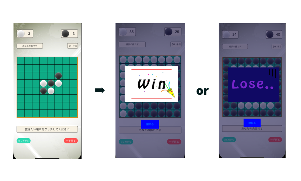 リバーシ k_shun OVERVIEW Swiftの学習のために作成 YEAR 2020 <概要> Swiftの学習のため何かアプリを作ろうと思い作成。以前、Line Botでリバーシを作ったので、それを元に作成しました。効果音はGarageBandで作成石、ロゴはphotoshopで作成盤面はCollectionViewで再現盤面の情報はcore dataの保存<画面>