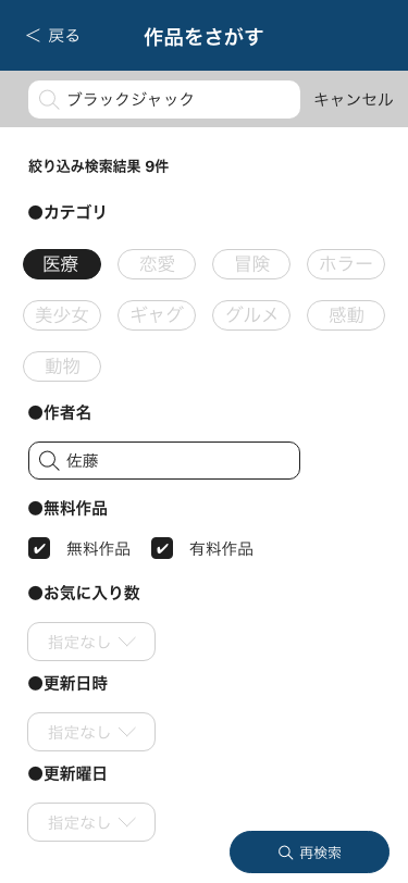 漫画アプリのUIデザインをするにあたって、いくつかの漫画アプリを試しにインストールして使ったときに、どれか一つの条件でしか検索できず、見たい作品を探し出すのに時間がかかるようなアプリが多くありました。なので検索ページでは、カテゴリやキーワード、お気に入りの数など複数の条件から細かく絞り込んで作品を探せるようにして、より自分の見たい作品を見つけやすいようにしました。