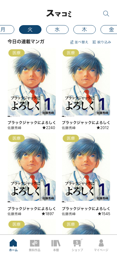 ペルソナの男性は、毎朝出社時に漫画を読む、ということなので、トップページでは曜日ごとに漫画をまとめ、その日に更新された新着漫画をすぐ読めるようにしました。
