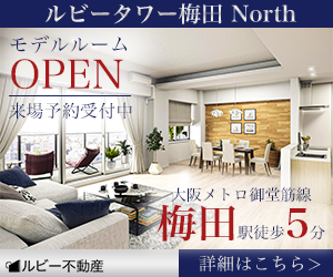 物件名(ルビータワー梅田North)/モデルルームオープン/来場予約受付中/Osaka Metro御堂筋線「梅田」駅徒歩5分/「詳細はこちら」の誘導ボタン
