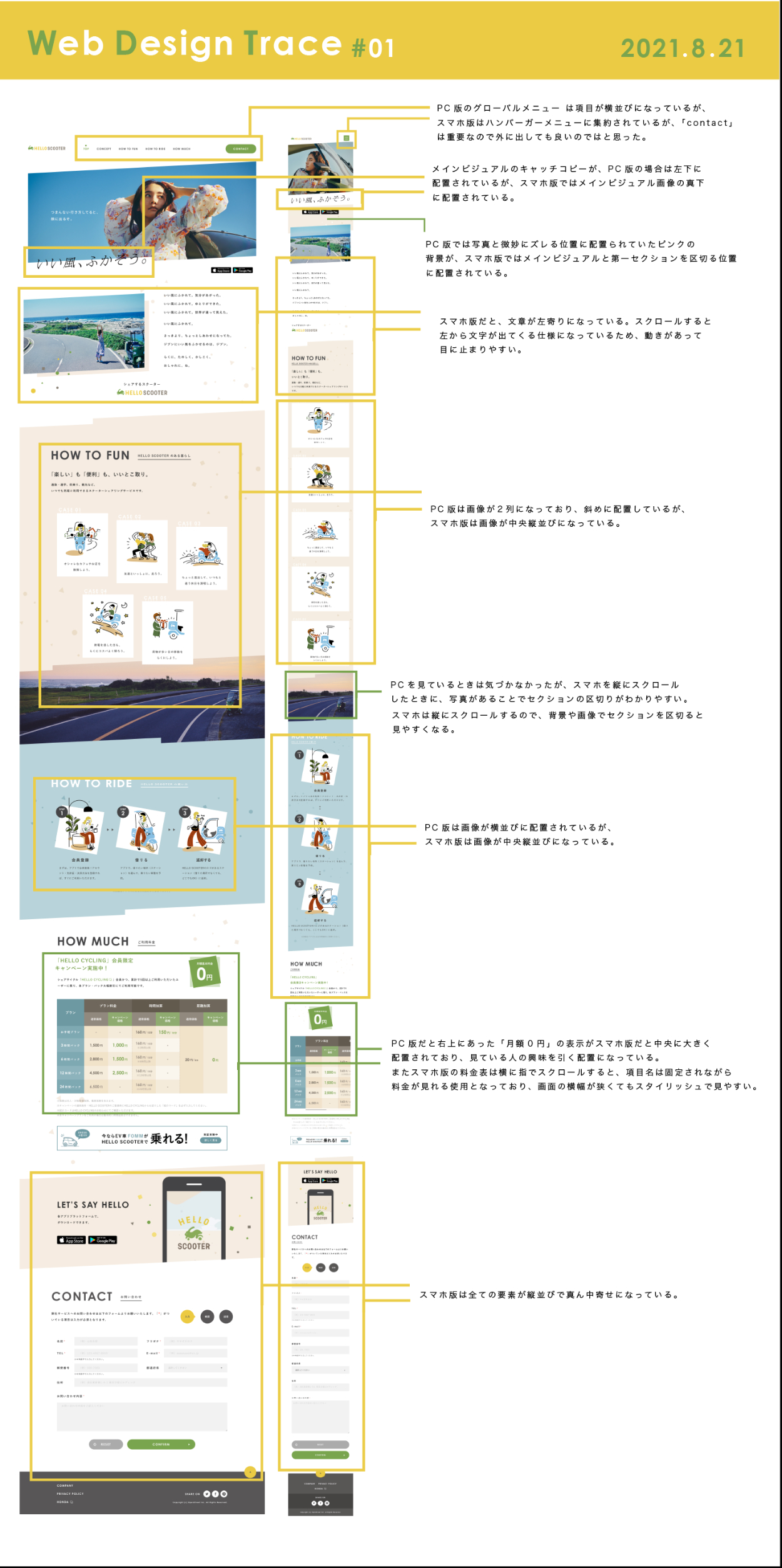 SHElikes MULTI CREATOR PROJECTの課題、LPトレースとデザイン分析に取り組みました。「HELLO SCOOTER」さんのLPをトレースし、デザインガイド・PCとスマホのデザイン比較分析シートを作成しました。(制作期間:1週間)