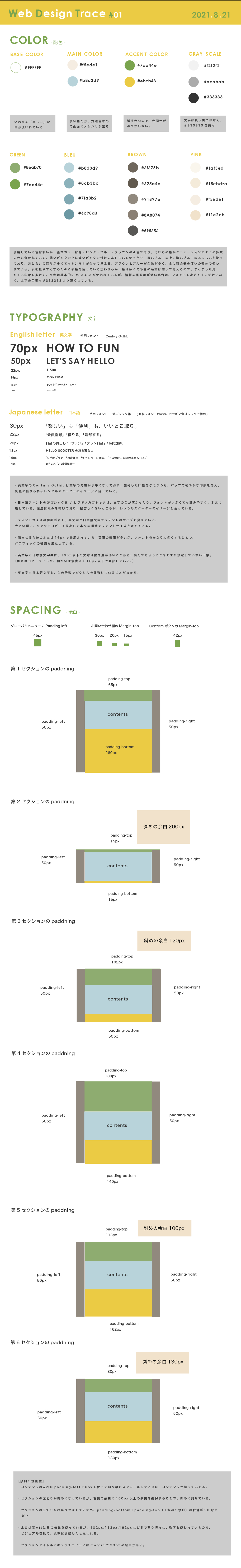 今回トレースしたサイトは多くの色を使っているように見えましたが、分析してみると、まとまりのある配色であることがわかりました。ピンクやブルー、ブラウンはグラデーションのように色が分かれており、それらを随所で使うことでカラフルで楽しげな印象でありつつも、まとまりのあるデザインに見えると思いました。