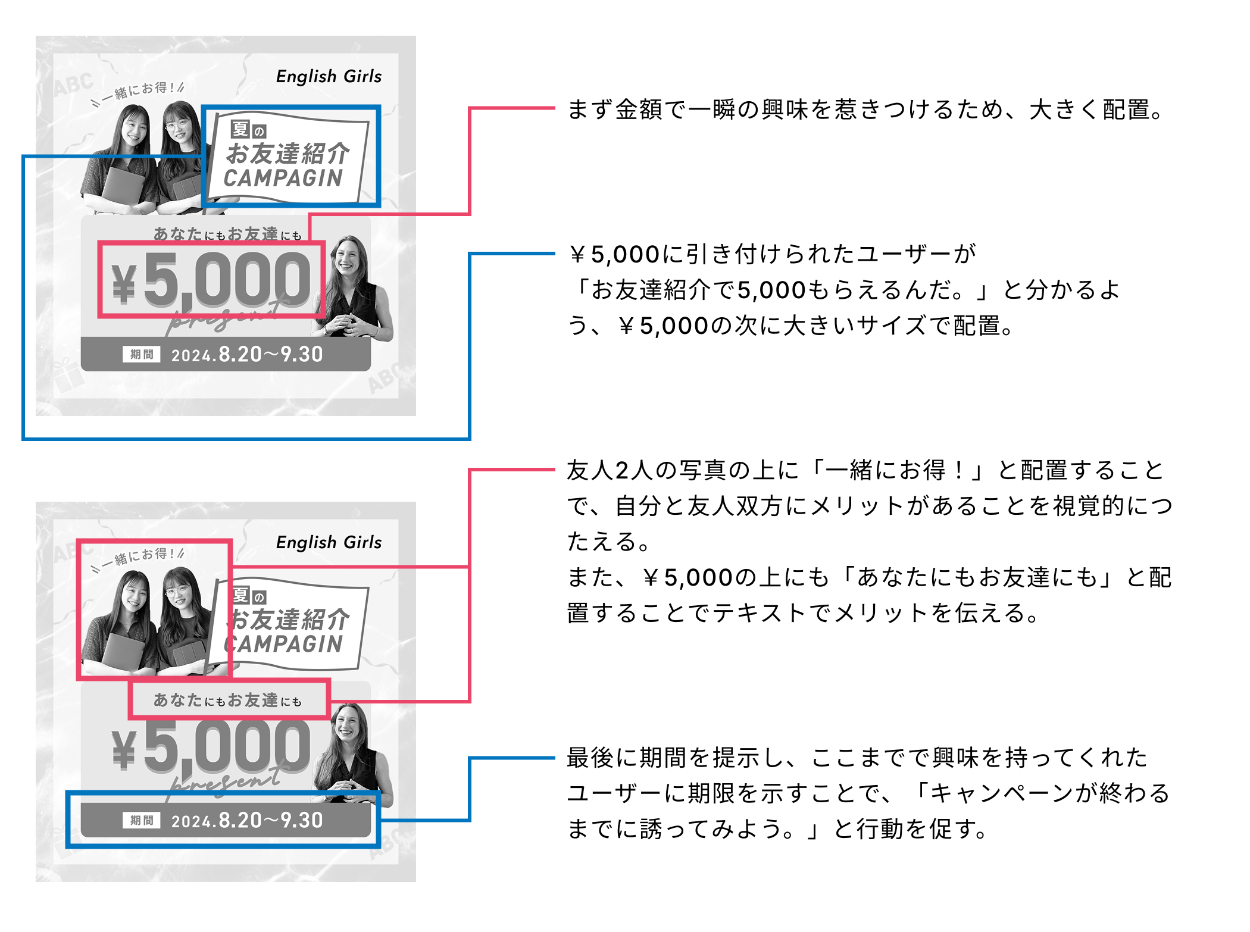 お友達紹介キャンペーンのバナーをリサーチした結果、以下の傾向があった。