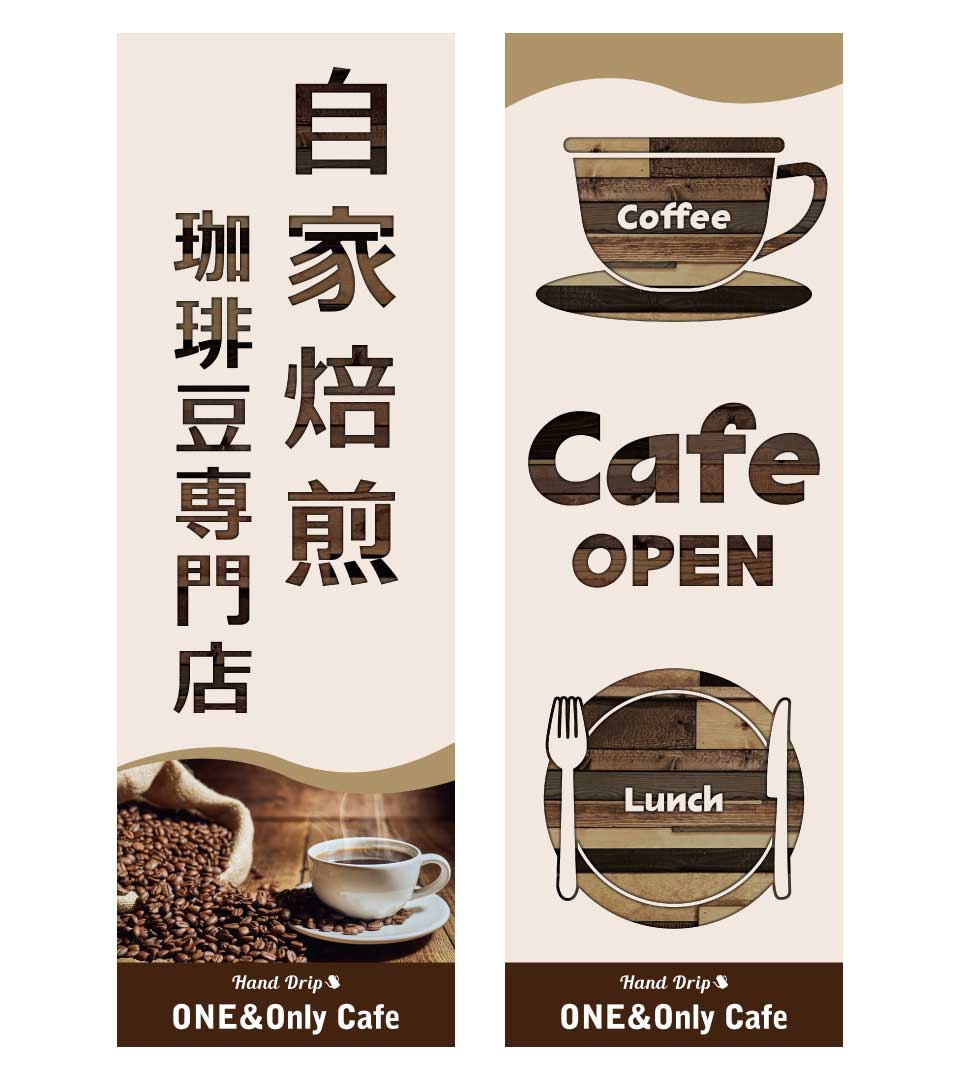 2種類ののぼりが調和するようにデザインに共通点を持たせるため、ロゴタイプの位置を統一し、珈琲の香りが漂うイメージの波線を入れ、共通して木目調のテクスチャをテキストやイラストで切り抜くことにしました。