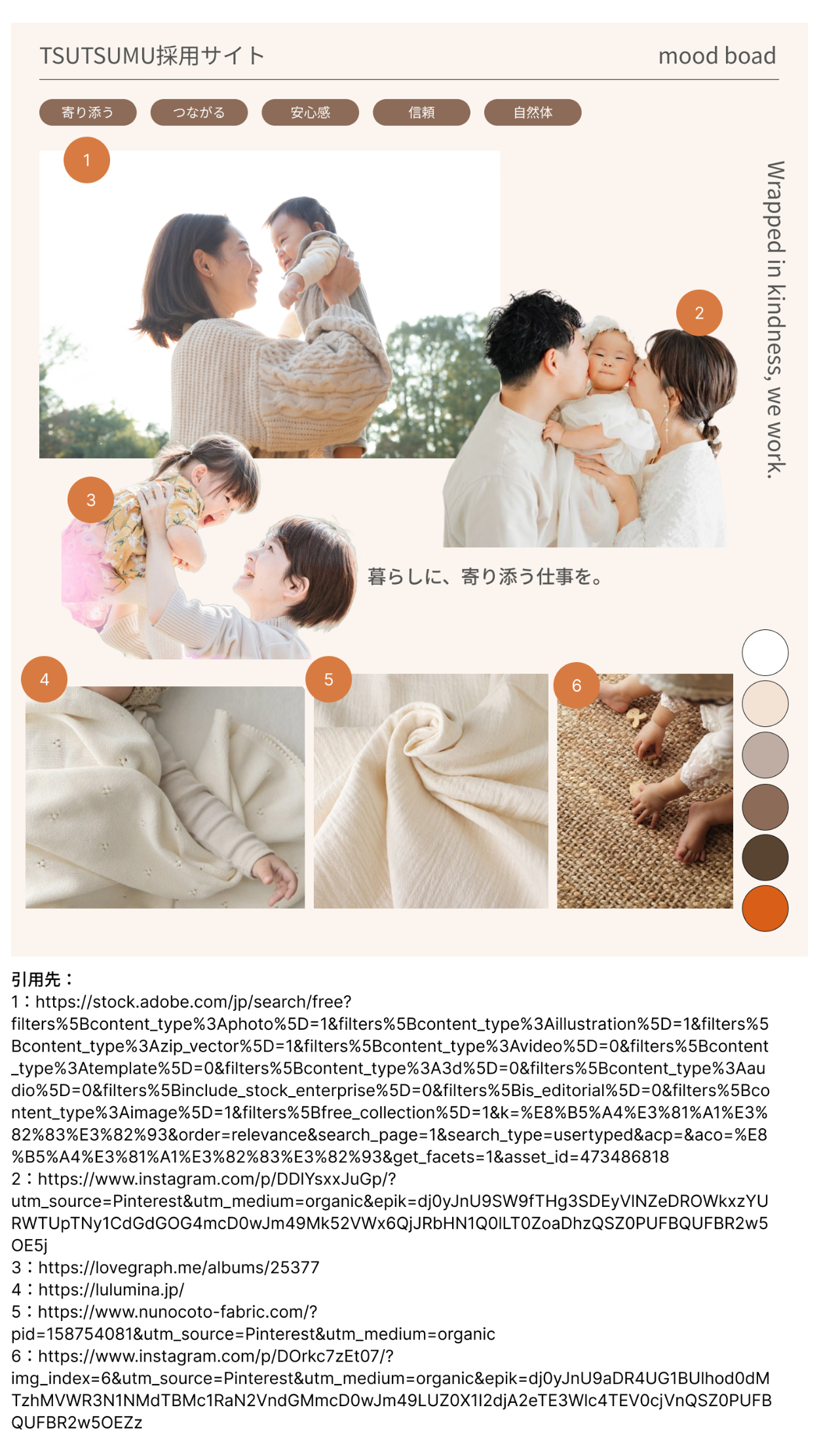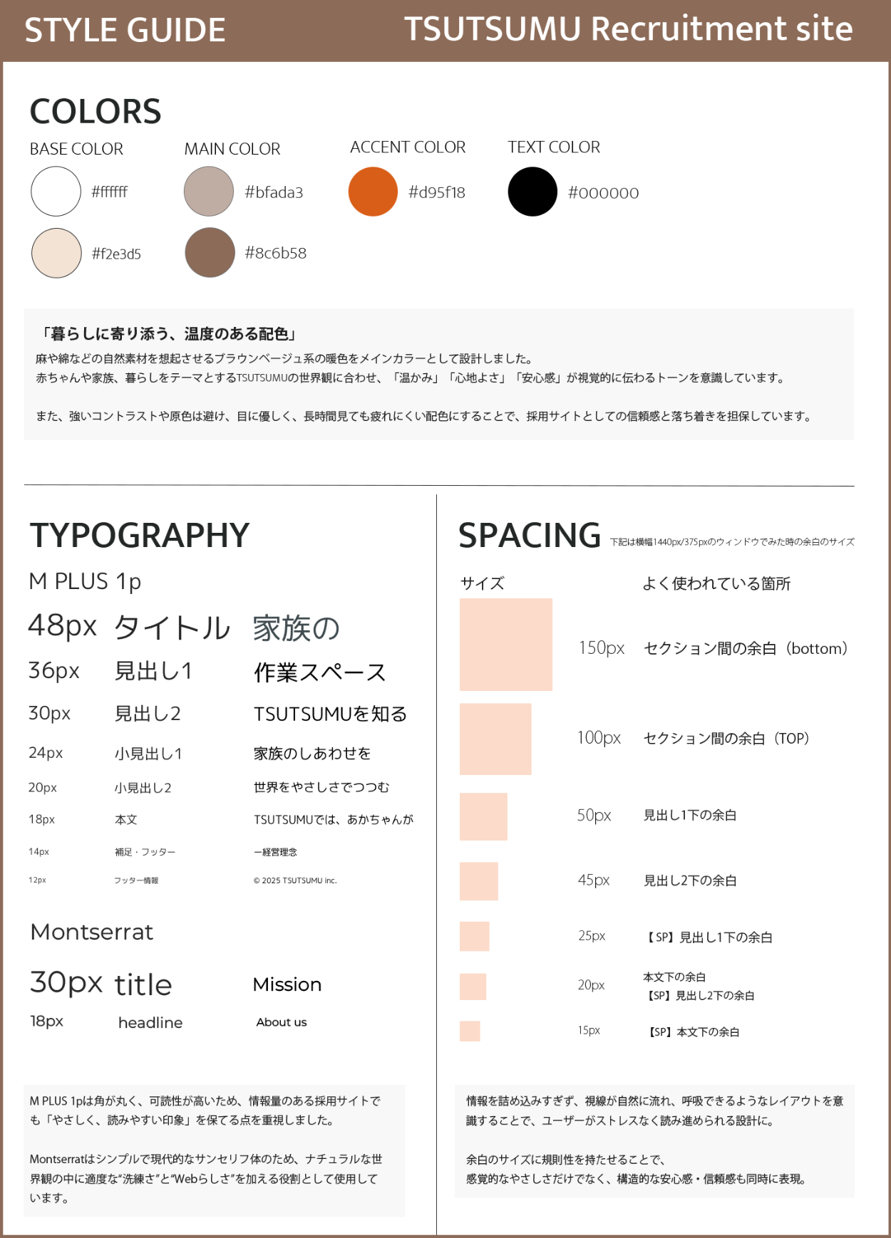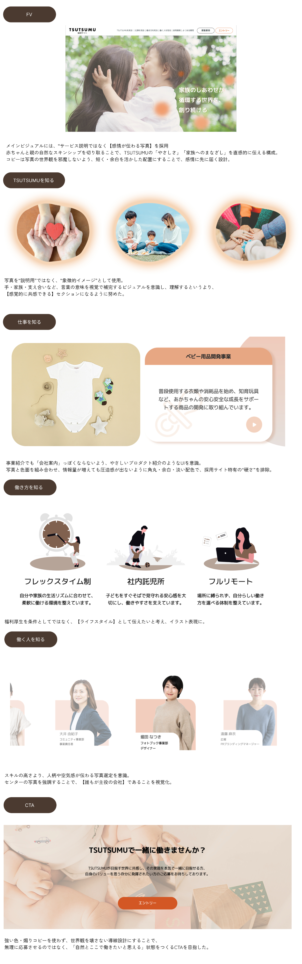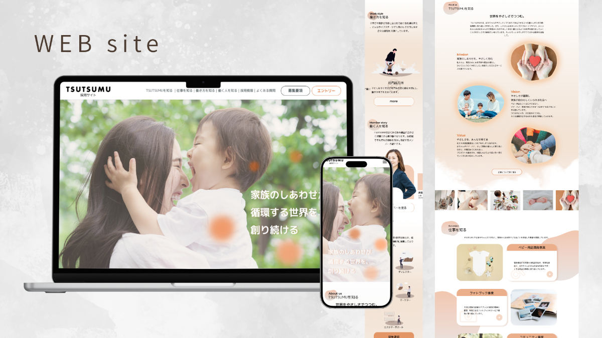 赤ちゃんや家族の暮らしを大切にしてきたTSUTSUMUの想いを、そのまま“働く環境”にも重ね合わせたコンセプトです。やわらかく誠実な価値観に共感し、自分の人生や家族との時間も大切にしながら働きたい──そんな人が自然と惹かれるような、あたたかく安心感のある世界観を目指しました。
