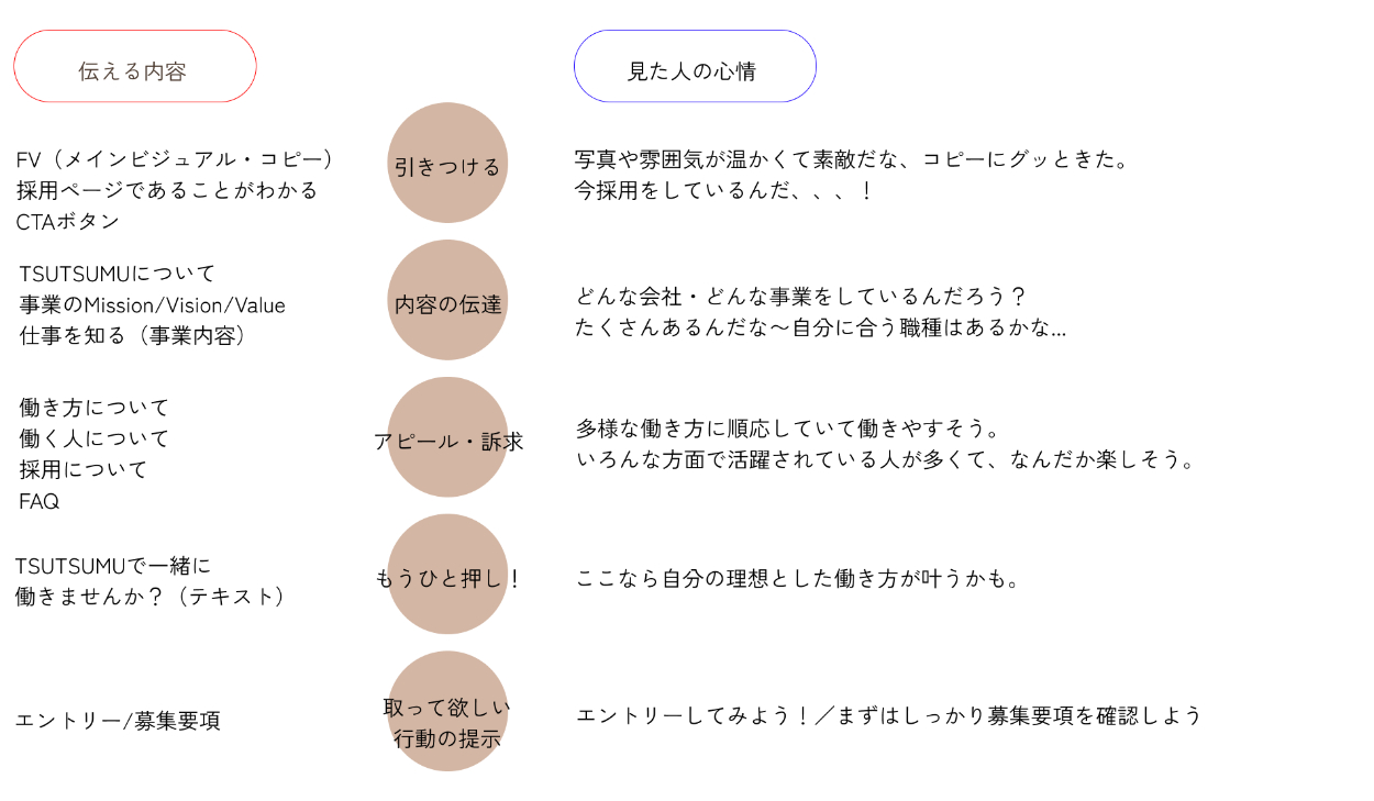 応募者が“ここでなら自分らしく働けそう” と感じられる心地よさを意識したテーマです。過度な飾りを排し、ゆったりとした余白や穏やかな色調で、TSUTSUMUの本質である「やさしさ」「家族へのまなざし」「誠実なものづくり」を視覚的に表現しています。