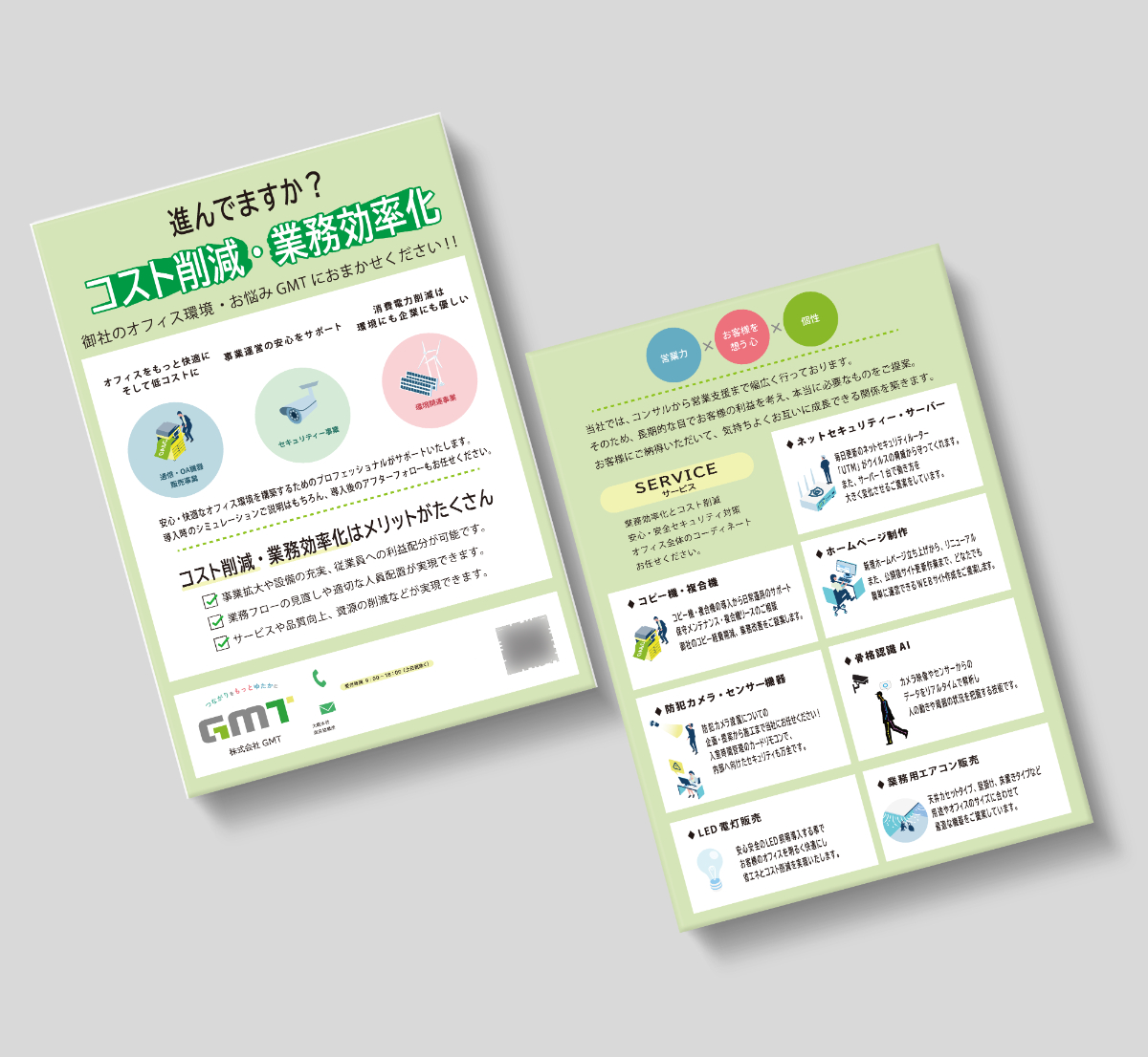 - 展示会でたくさんの企業チラシが配布される事を考え、表は伝えたい要素を絞り、 タイトルで目立たせながらもイメージカラーを大事に制作しました。